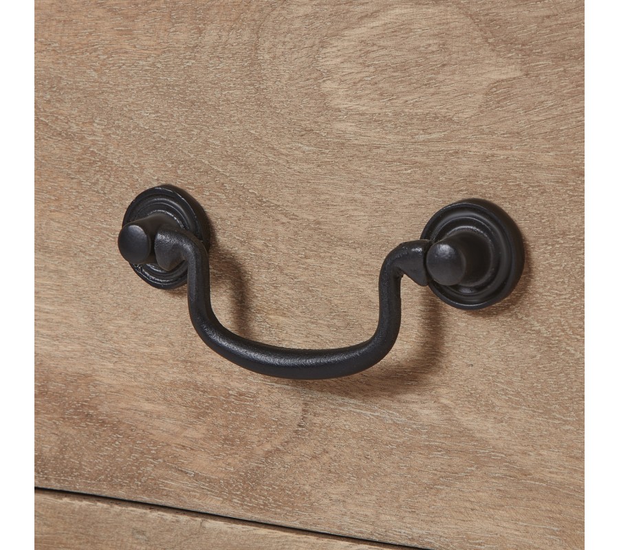 Na zásuvke je na každom segmente umiestnená osobitná úchytka - dve visiace poloblúkové po stranách a jedna malá okrúhla v strede. Prevedenie z tmavého kovu pôsob starožitným dojmom. Spodná strana zásuvky je tvarovaná do zvlnenej línie.