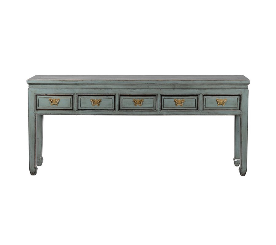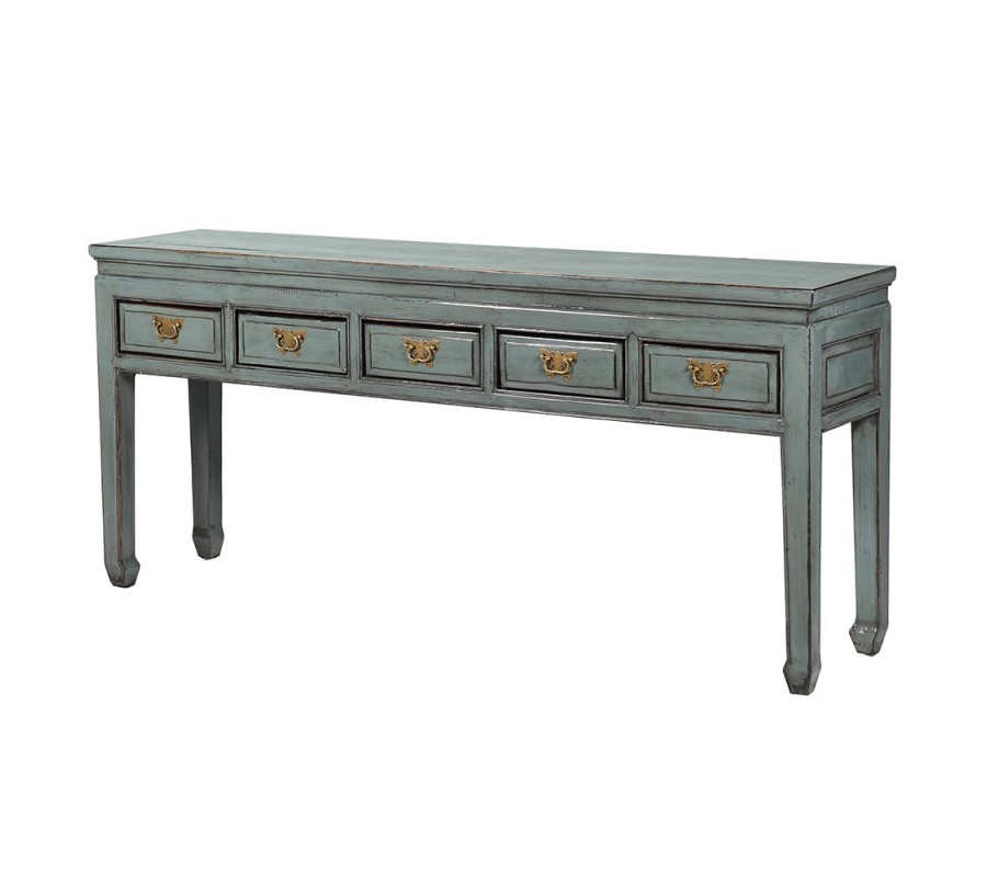 Luxusný vintage modrý konzolový stolík Castello z masívneho dreva s patinou so zásuvkami so zlatými dizajnovými úchytkami 180 cm