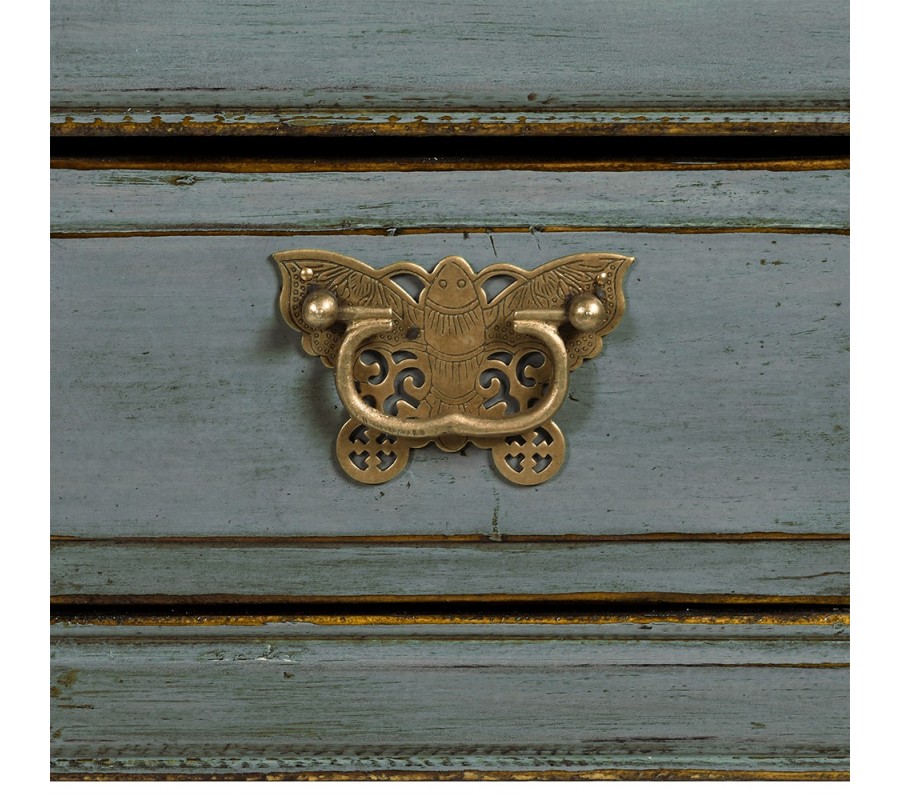 Úchytky sú vyrobené z kovu v matnej zlatej farbe a zdobené jemnými rytými vzormi. Ich tvar motýlích krídiel a vyrezávané detaily navodzujú dojem historických šperkov. Stolík stojí na štyroch štíhlych nožičkách so zaobleným zakončením, ktoré harmonicky ladia s celkovým dizajnom, pričom zabezpečujú maximálnu stabilitu.
