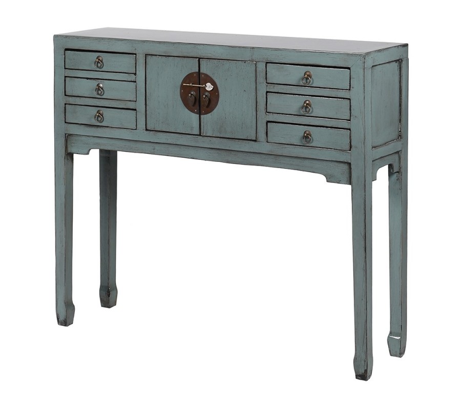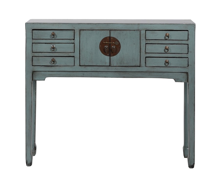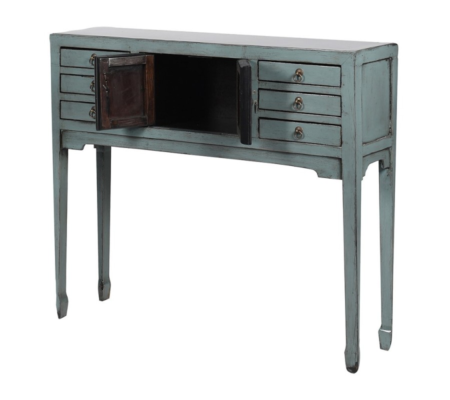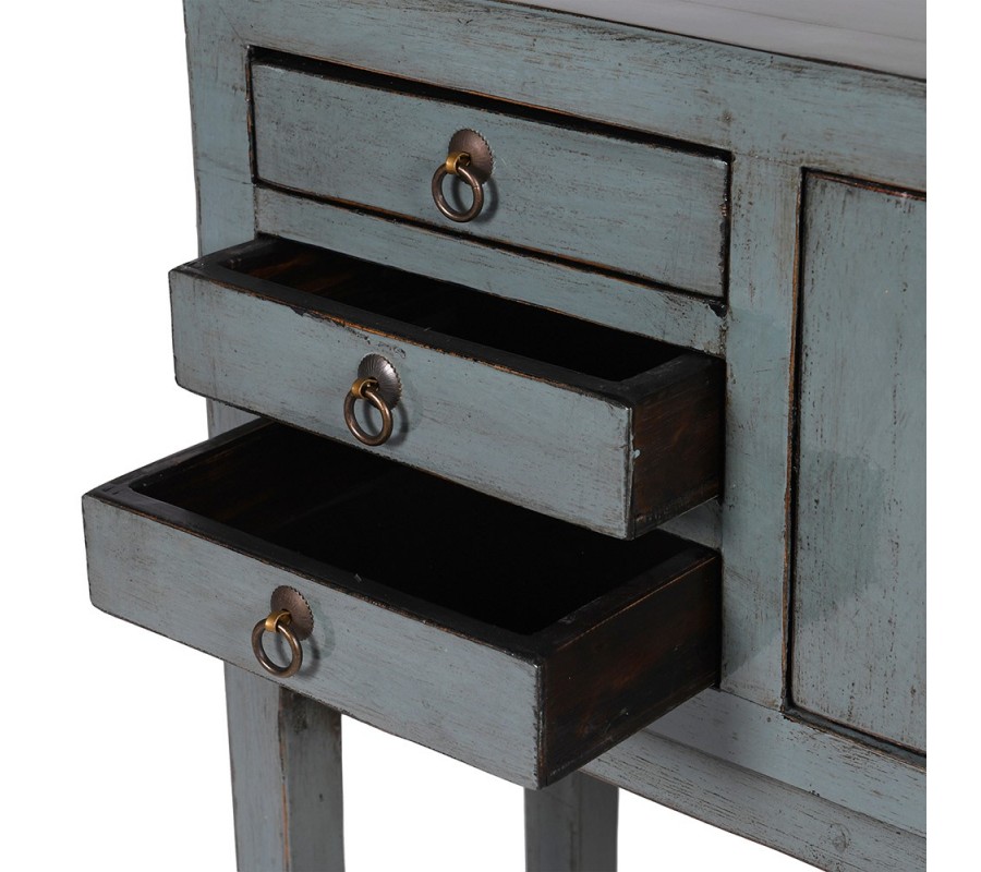 Luxusný vintage modrý konzolový stolík Castello s dvojitými dvierkami s orientálnou úchytkou a šiestimi zásuvkami 100 cm