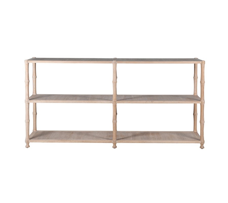 Luxusný koloniálny konzolový stolík Kamila z masívneho dubového dreva vyniká svojím obdĺžnikovým tvarom a tromi otvorenými policami s vrúbkovaným povrchom. Jemná štruktúra vrúbkovania s efektom vymytej patiny, dodáva stolíku remeselný výraz a podčiarkuje jeho prirodzený charakter.