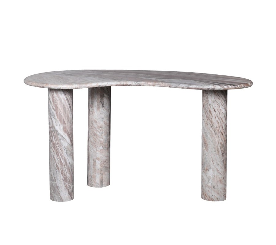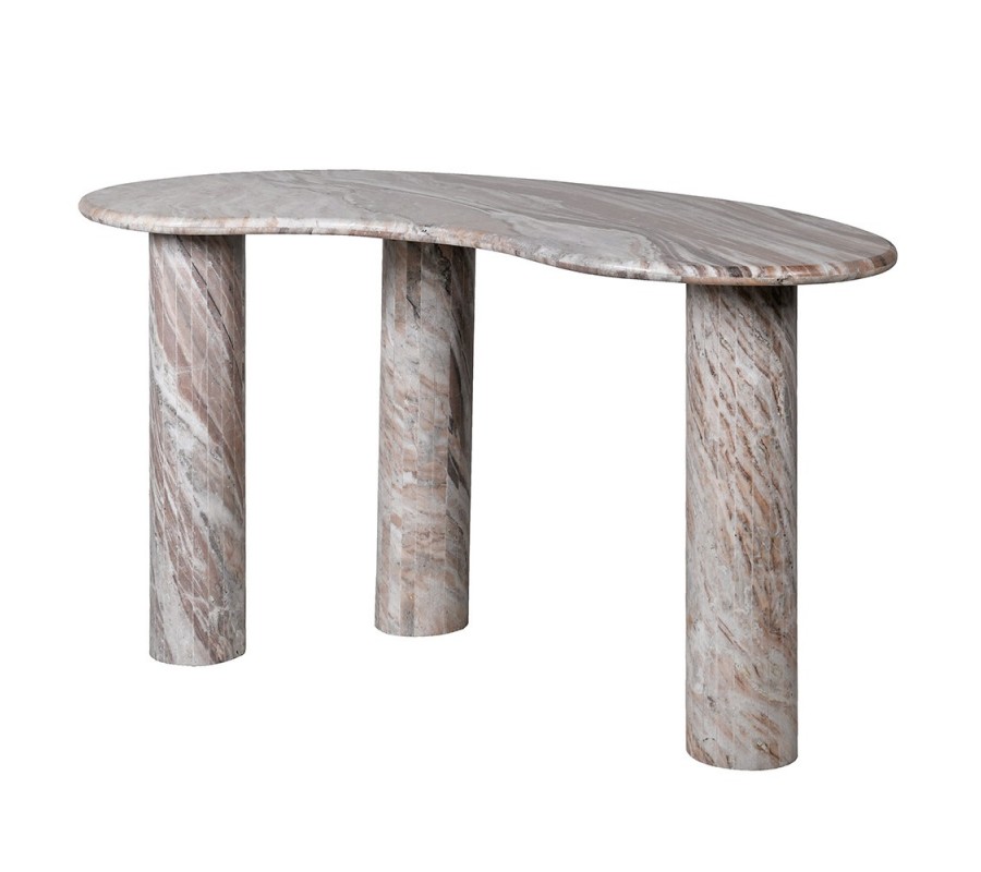 Luxusný asymetrický mramorový konzolový stolík Aureliola v hnedo béžovej farbe s tromi valcovými nožičkami 141 cm