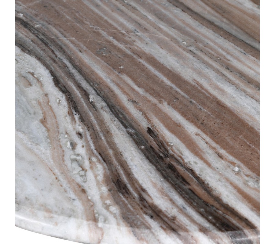 Stolík je vyrobený z kvalitného béžového mramoru s výrazným bielym a hnedým žilkovaním, ktoré sa prirodzene prelína po celej ploche. Kontrastná kresba kameňa dodáva stolíku hĺbku, noblesu a autentický luxusný charakter. Každý kus je originál s neopakovateľnou štruktúrou a farebnými prechodmi, ktoré vznikli prirodzeným formovaním kameňa.