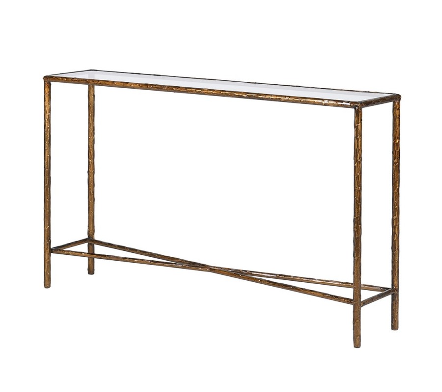 Glamour obdĺžnikový medený konzolový stolík Loper z kovu s mosadznou patinou a sklenenou priehľadnou doskou 127 cm