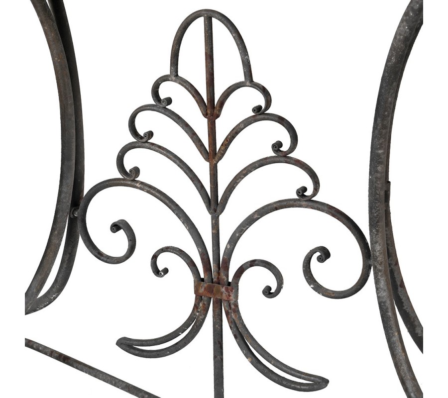 Nožičky aj nosná konštrukcia sú tvorené tenkými, elegantne vytočenými kovovými tyčami, ktoré vytvárajú jemný florálny a ornamentálny efekt. Pod vrchnou doskou sú kovové prvky dekoratívne vytočené do špirál, čo dodáva stolíku ľahkosť a klasický šarm. Spodná časť nožičiek je prepojená prekríženými spojovacími tyčami, ktoré zabezpečujú stabilitu a zároveň vytvárajú výrazný architektonický detail.