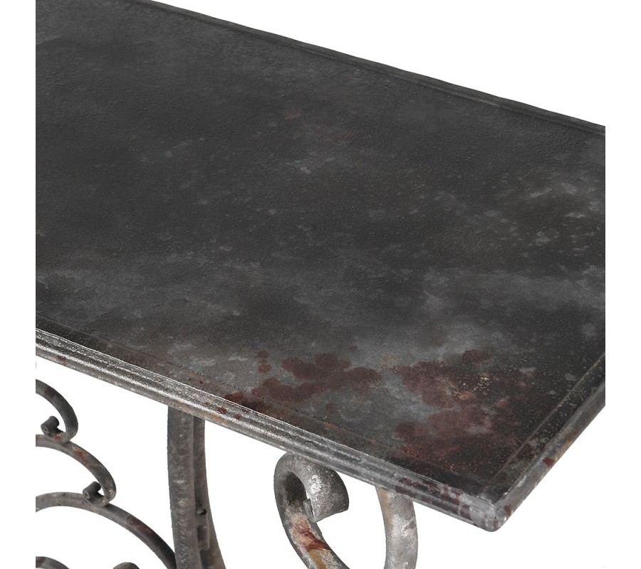 Konštrukcia stolíka je vyrobená z kovu v čiernom prevedení s dekoratívnou patinou. Táto povrchová úprava je čisto estetická – dodáva stolíku vintage hĺbku a vizuálnu autenticitu bez toho, aby pôsobila dojmom skutočného hrdzavenia. Vrchná doska má jednoduchý obdĺžnikový tvar, ktorý kontrastuje s bohato zdobenou podstavou a necháva vyniknúť detailné kovové spracovanie.