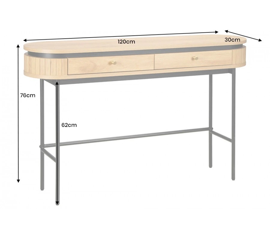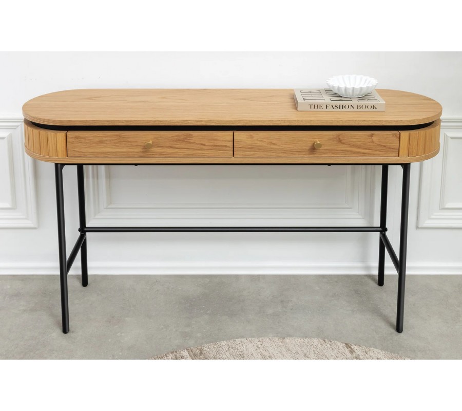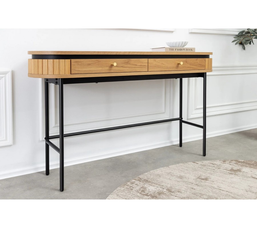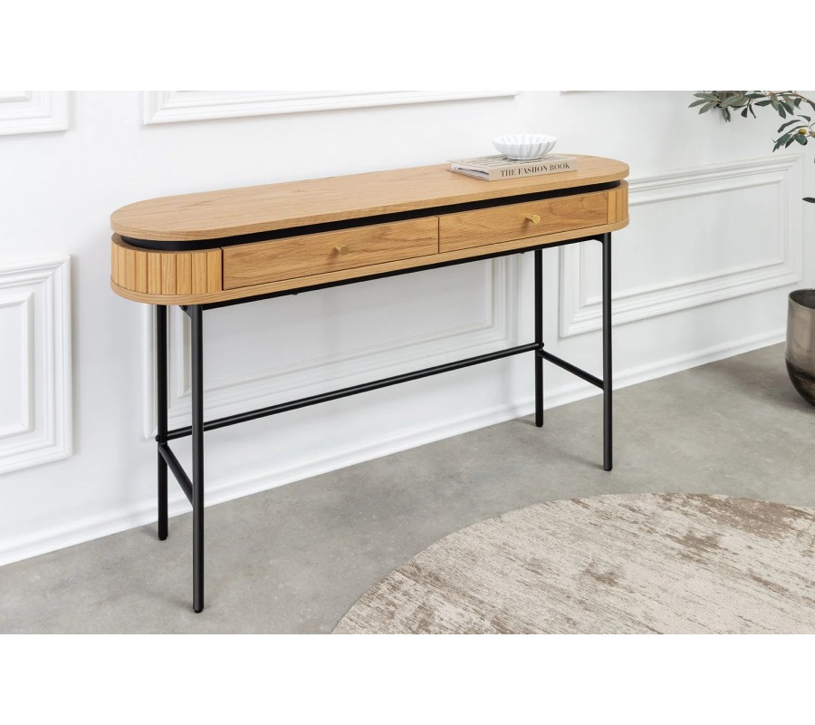 Dizajnový industriálny konzolový stolík Maderia s oválnou doskou a dvomi zásuvkami v dubovej hnedej a čiernej farbe 120 cm