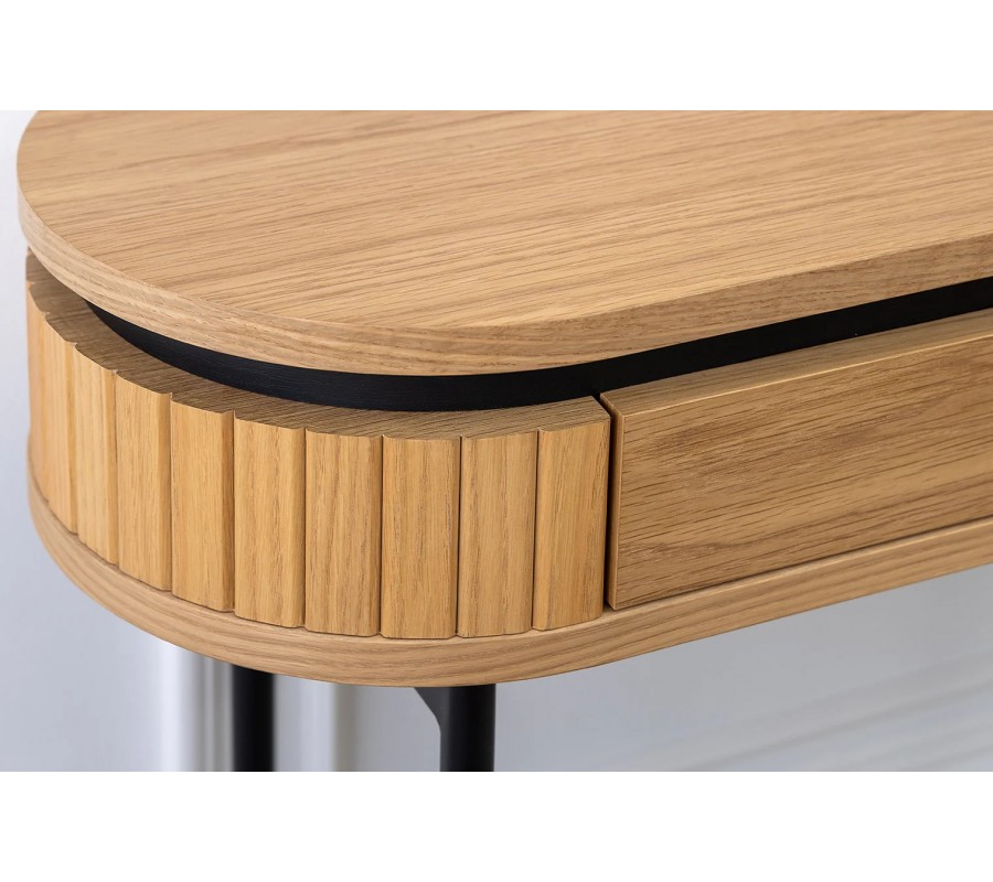 Vrchná doska je hladká, rovnako ako aj čelá dvoch vedľa seba umiestnených zásuviek. Dopĺňa ich okrúhla kovová úchytka v zlatej farbe a zvyšný obvod stolíka zdobí vertikálny lamelový reliéf, inšpirovaný dekorom v art deco štýle. Štyri nožičky majú štíhly valcovitý profil a na zadnej a bočných stranách sú prepojené lineárnou výstuhou. Nábytok je tak stabilný a vďaka voľnej prednej strane zároveň umožňuje využitie priestoru pod ním.
