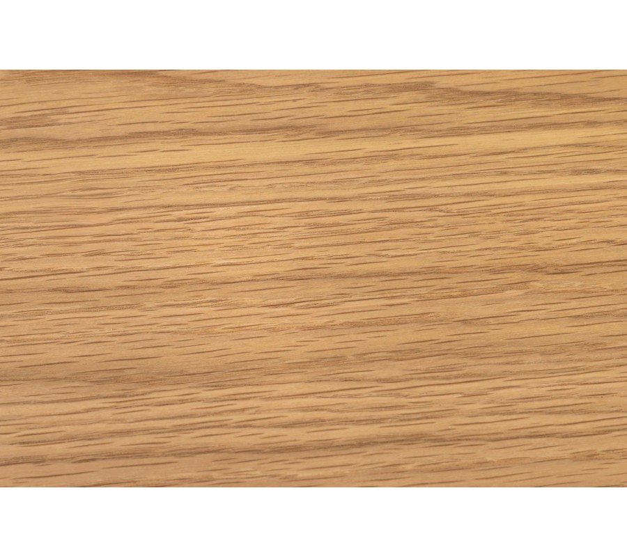 Vrchná časť stolíka má oválny tvar a je vyrobená z dubovej dyhy v prírodnom svetlom hnedom odtieni s pravidelnou kresbou letokruhov. Pod vrchnou doskou sa nachádza zúžená lišta s čiernym lakovaním, ktorá v kombinácii s kovovou podstavou v matnej čiernej farbe vytvára moderný akcent.