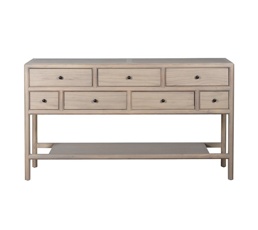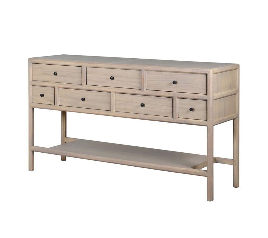 Luxusný škandinávsky konzolový stolík Angus so siedmimi zásuvkami a otvorenou policou v svetlej hnedej farbe 160 cm