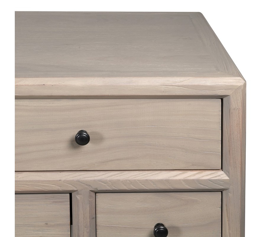 Stolík má obdĺžnikovú vrchnú dosku a pod ňou je umiestnených sedem zásuviek v dvoch radoch. Vo vrchnom rade sa nachádzajú tri rovnako široké zásuvky a v spodnom rade sú v strede dve široké zásuvky a na každej strane jedna úzka zásuvka. Táto asymetrická organizácia pôsobí moderným dojmom a vizuálne nábytok ozvláštňuje. Úchytky sú vyrobené z kovu v čiernej farbe a majú minimalistický okrúhly dizajn.