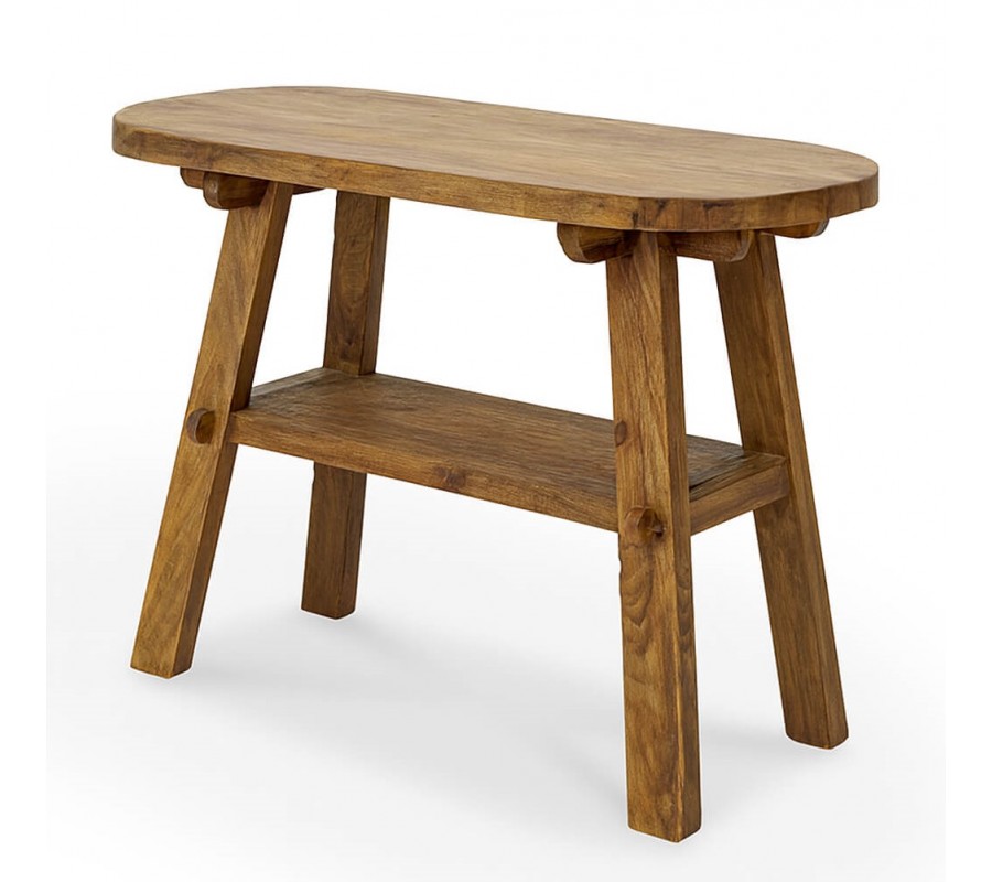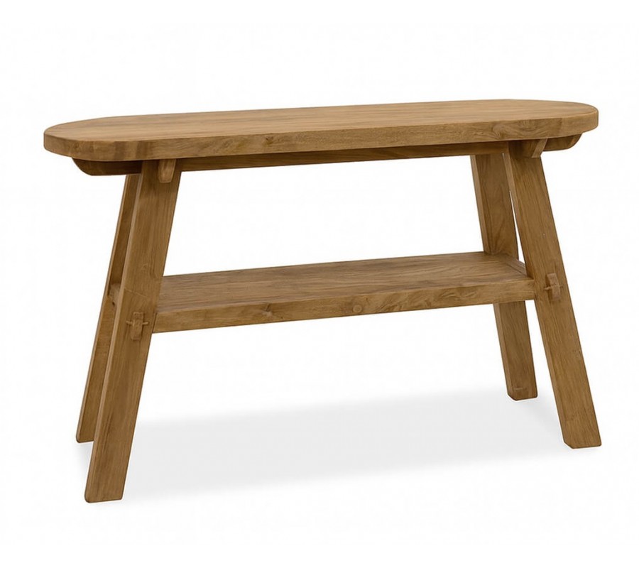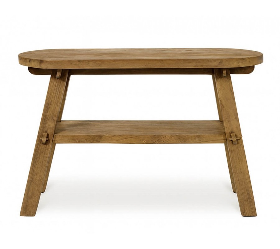 Luxusný vidiecky oválny konzolový stolík Shetland s policou a šikmými nohami z hnedého masívneho teakového dreva 120 cm