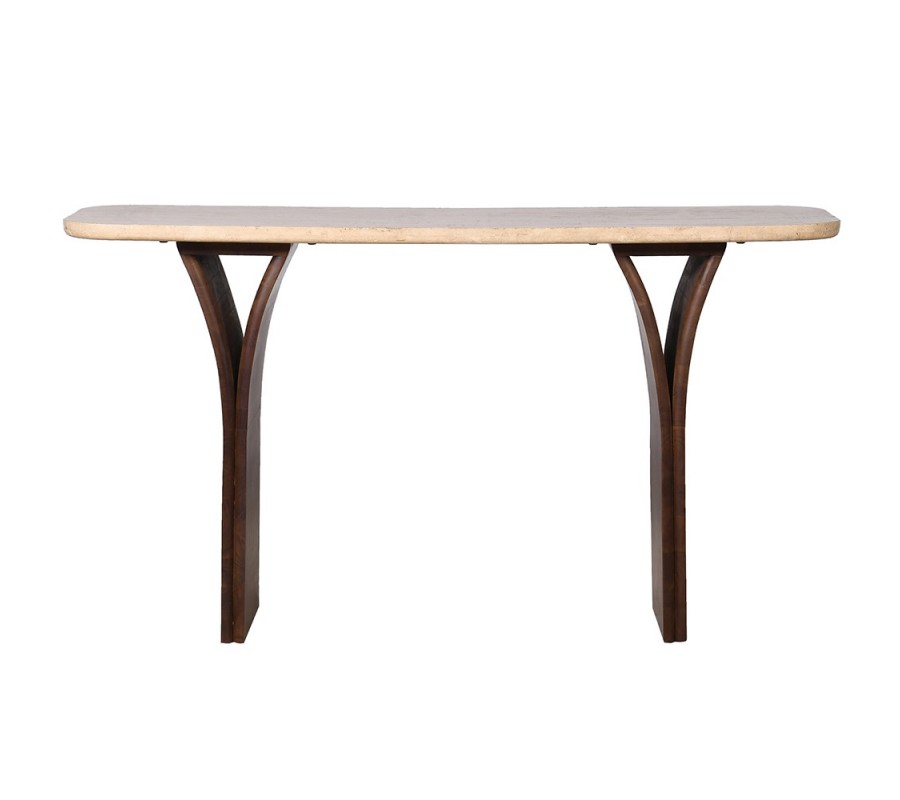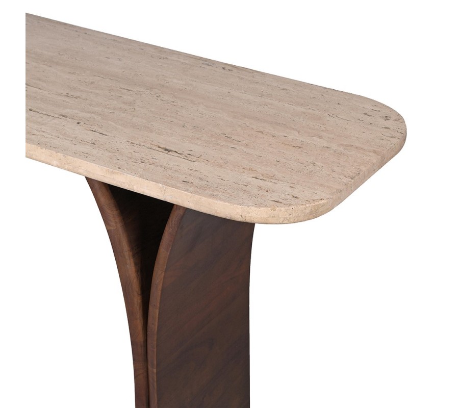 Luxusný moderný dizajnový konzolový stolík z travertínového mramoru pôsobí elegantne, sofistikovane a architektonicky výrazne. Obdĺžniková doska so zaoblenými hranami je vyhotovená v jemnej béžovej farbe, ktorá zvýrazňuje prirodzenú kresbu kameňa, jeho póry a jemné farebné prechody. Travertín dodáva stolíku nadčasový charakter a pocit exkluzivity, pričom každý kus je vďaka prírodnému materiálu originálom.