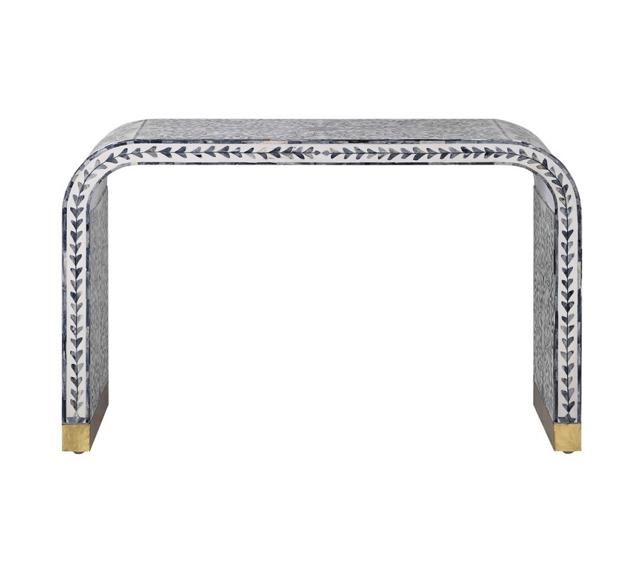 Etno obdĺžnikový modro biely konzolový stolík Daytona s oblými rohmi s intarziou z byvolej kosti a mosadznými detailmi 123 cm