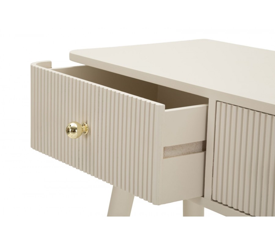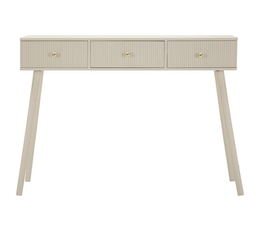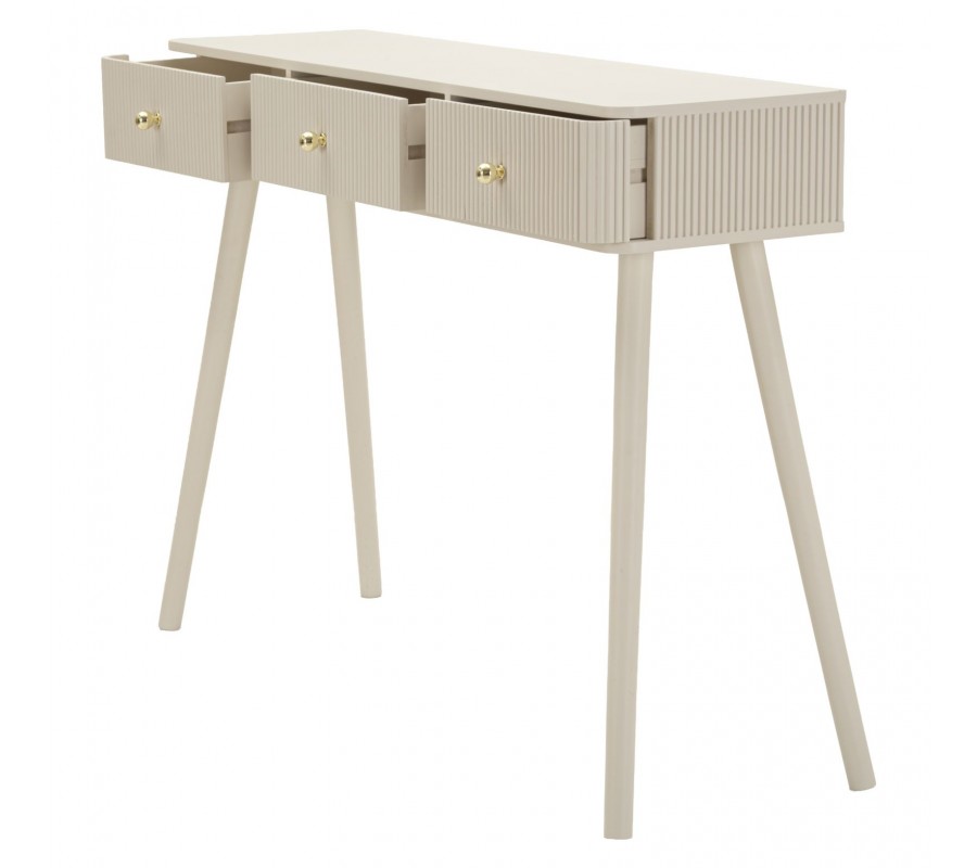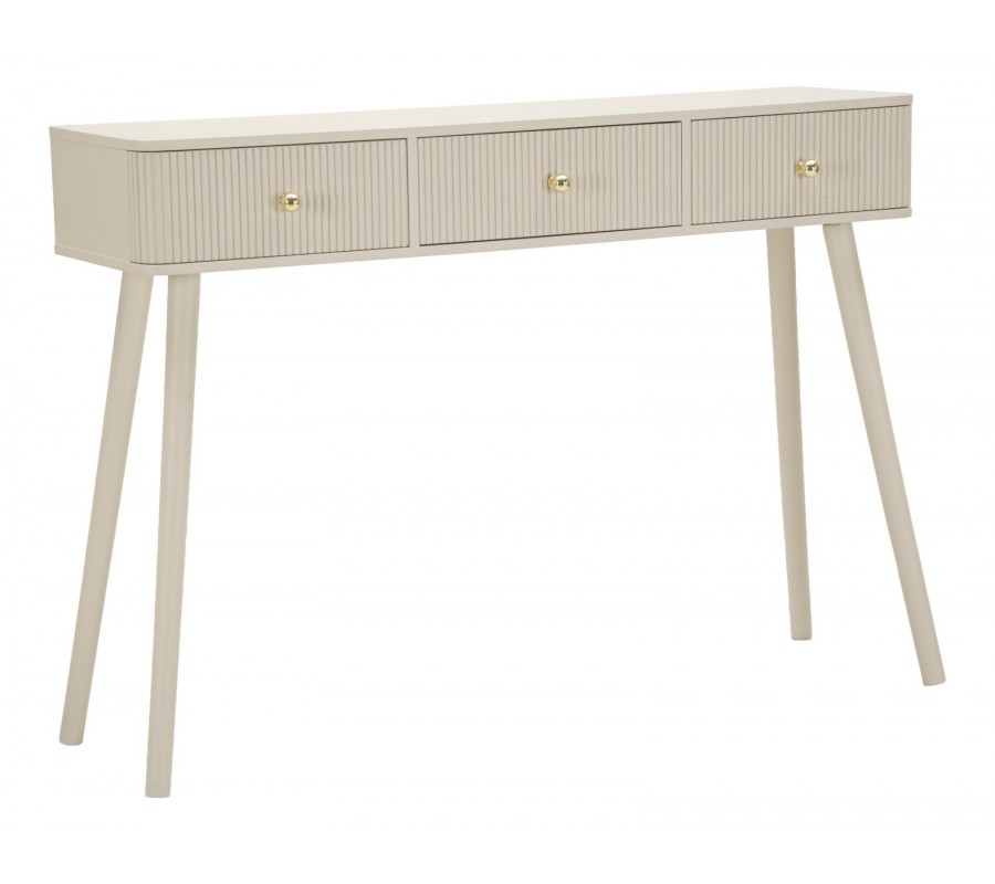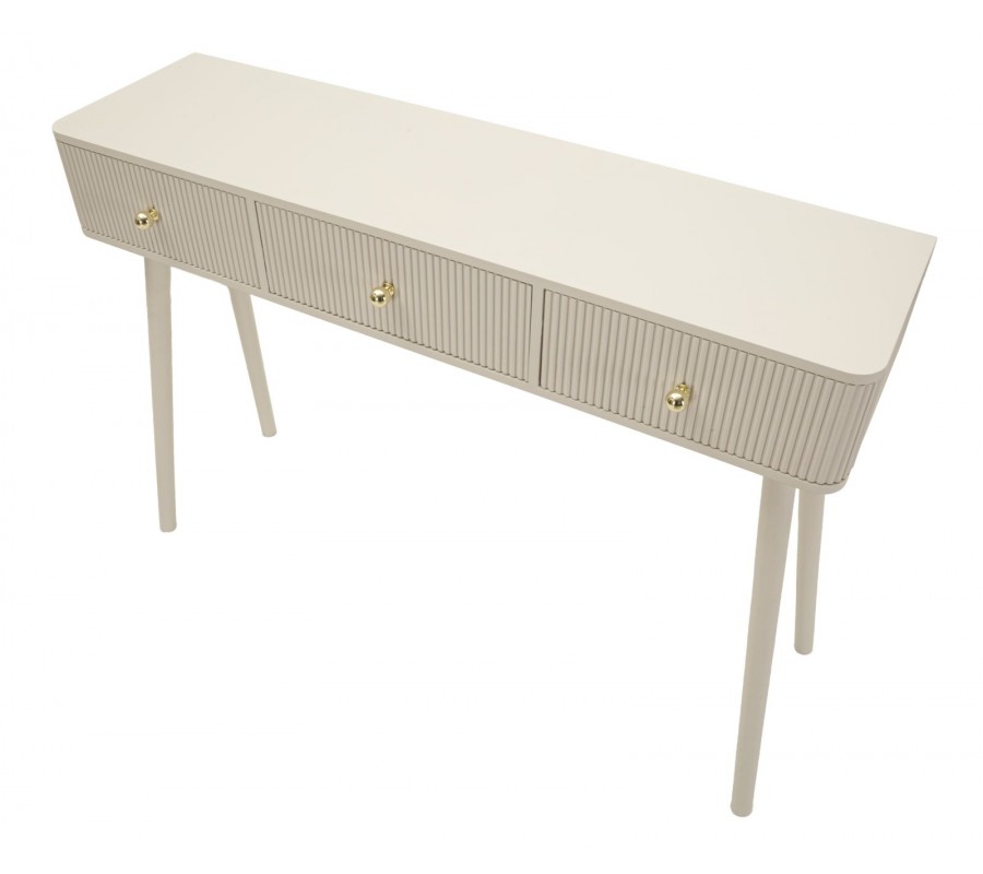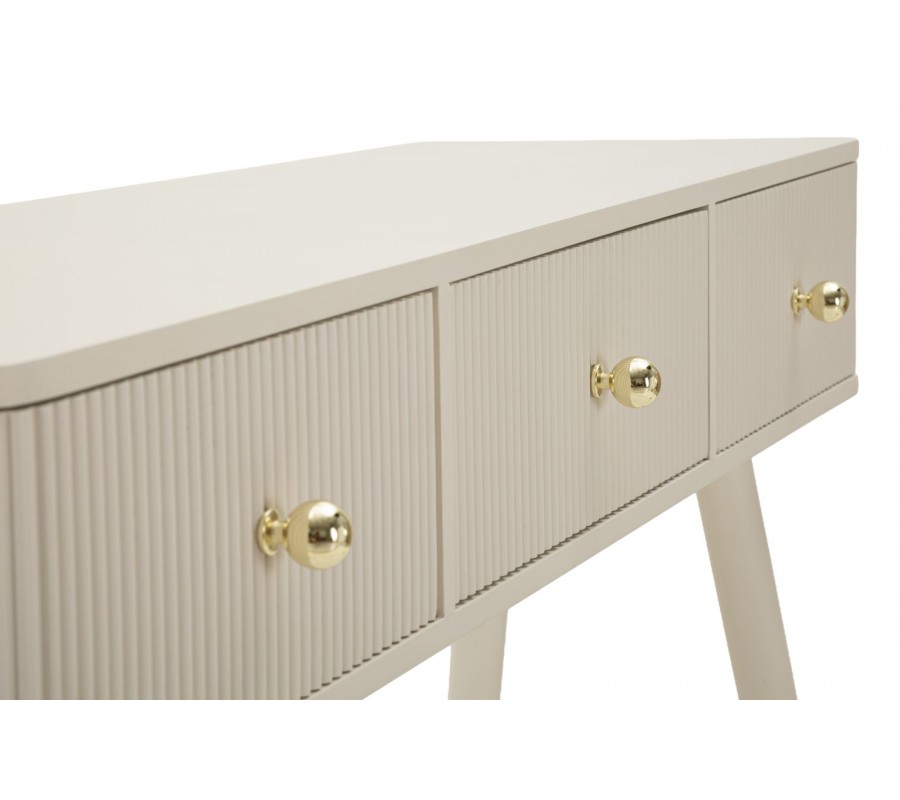 Dizajnový art deco konzolový stolík Shelly s tromi zásuvkami so zlatými úchytkami a rebrovaným zdobením béžový 103 cm