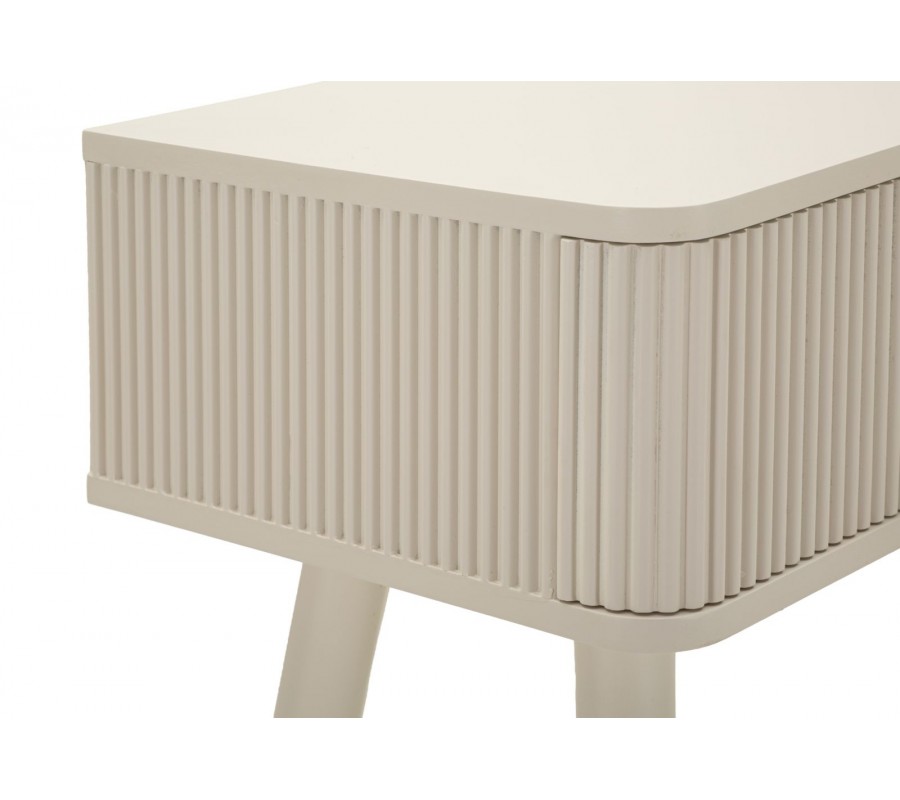 Úložný priestor pozostáva z troch zásuviek, umiestnených vedľa seba. Na prednej a bočných stranách ho zdobí vertikálny drážkovaný reliéf, typický pre art deco štýl. Guľaté úchytky sú vyrobené z kovu a majú lesklé zlaté prevedenie, ktoré ešte podčiarkuje túto estetiku a vytvára sofistikovaný akcent k svetlému krémovému lakovaniu.
