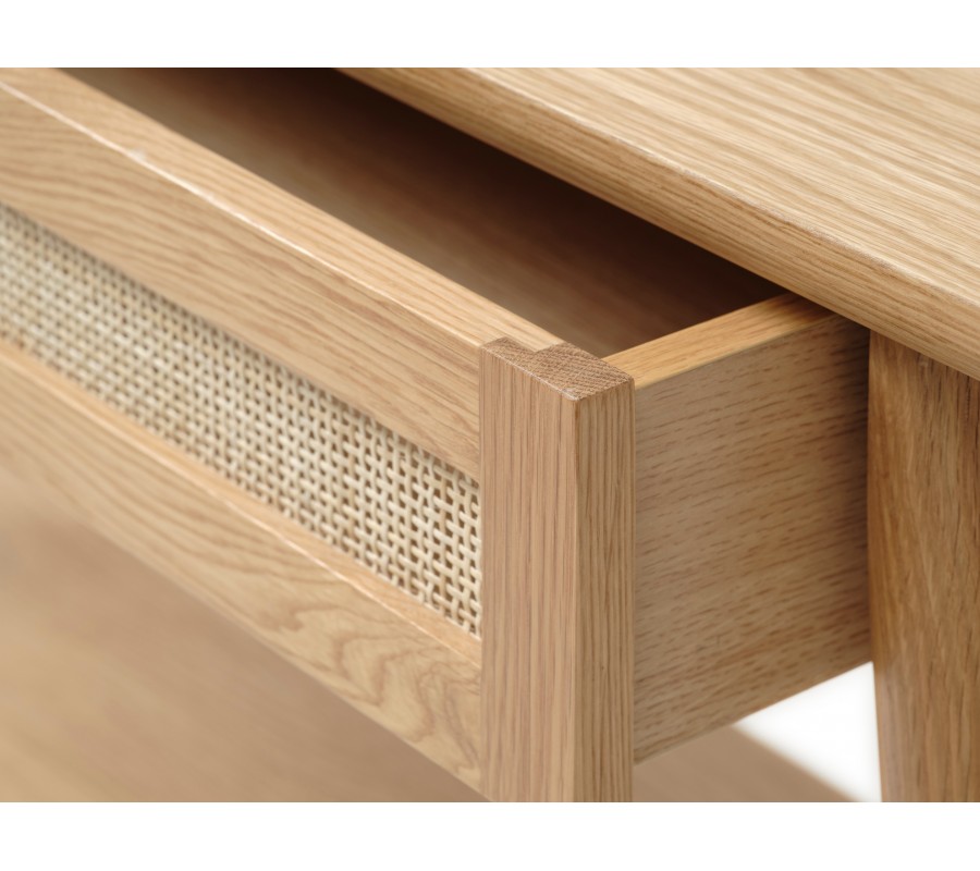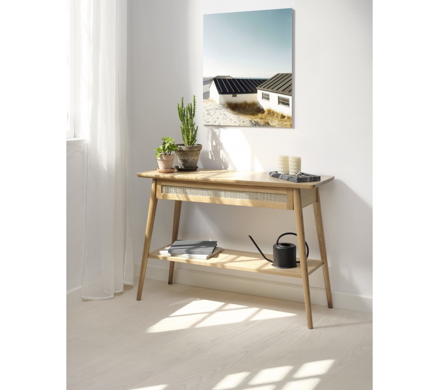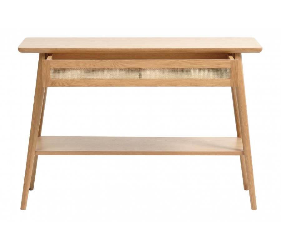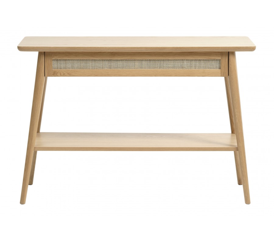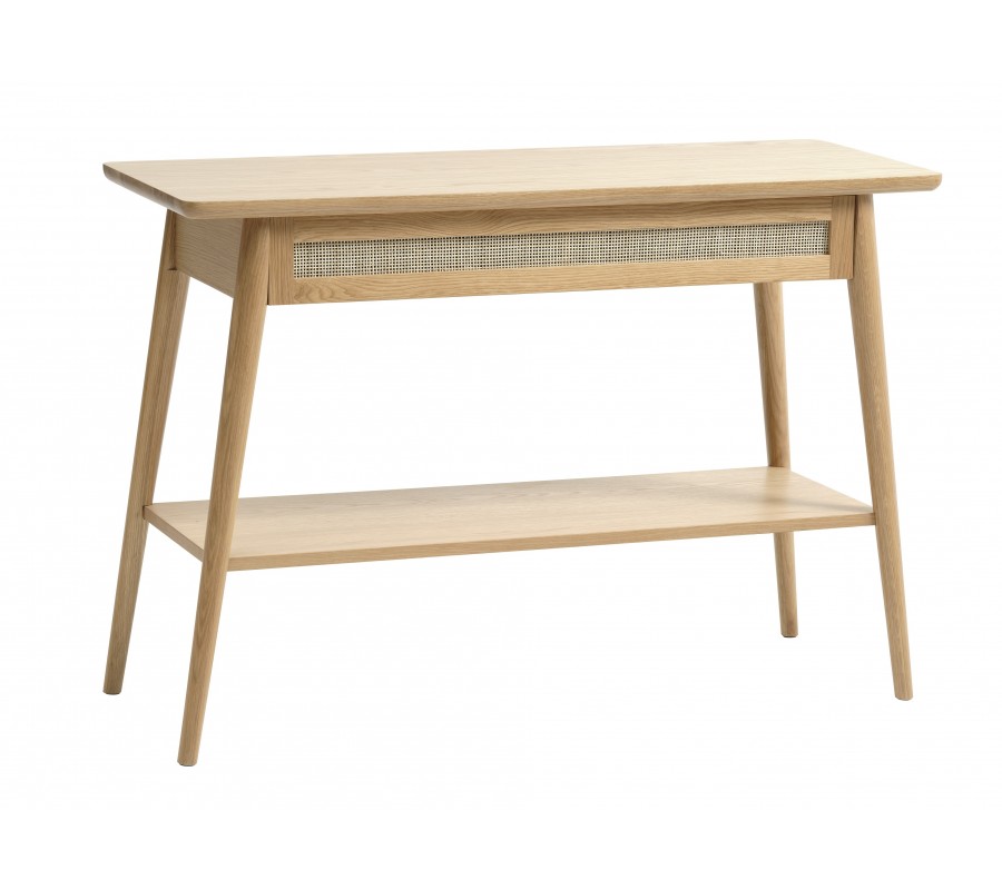 Škandinávsky konzolový stolík Aarhus vo svetlom dubovom hnedom prevedení s policou a zásuvkou s ratanovým výpletom 110 cm