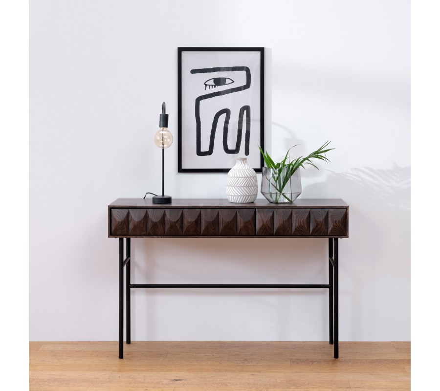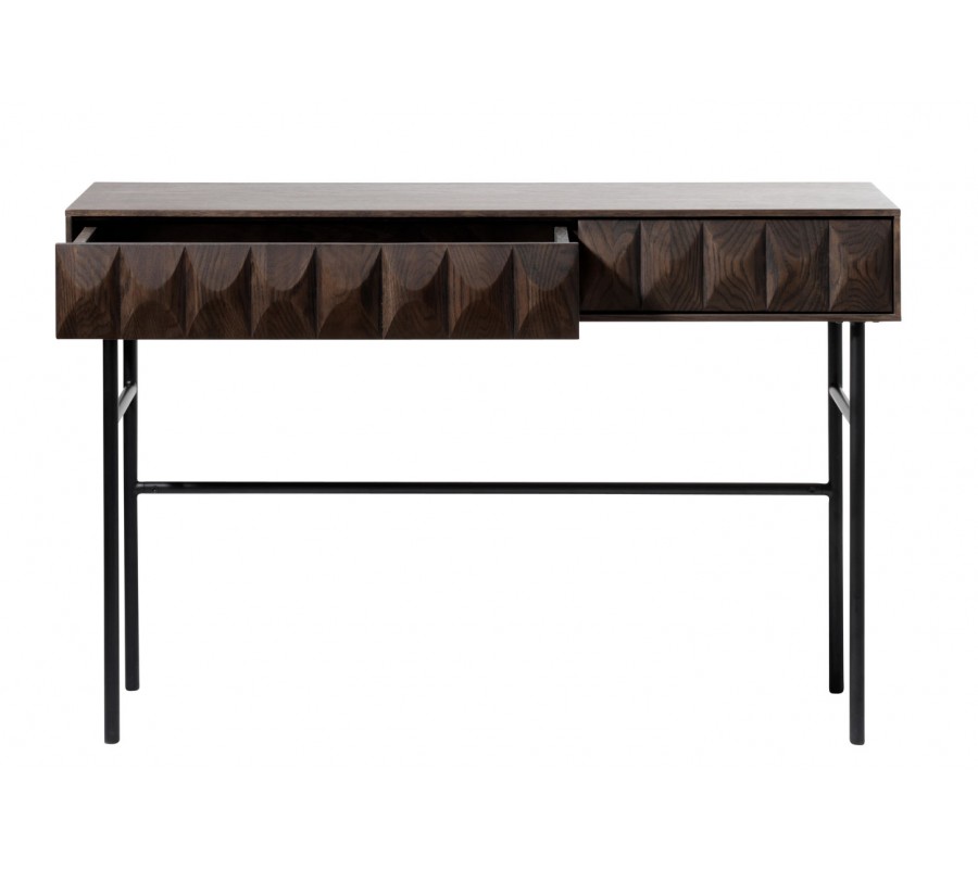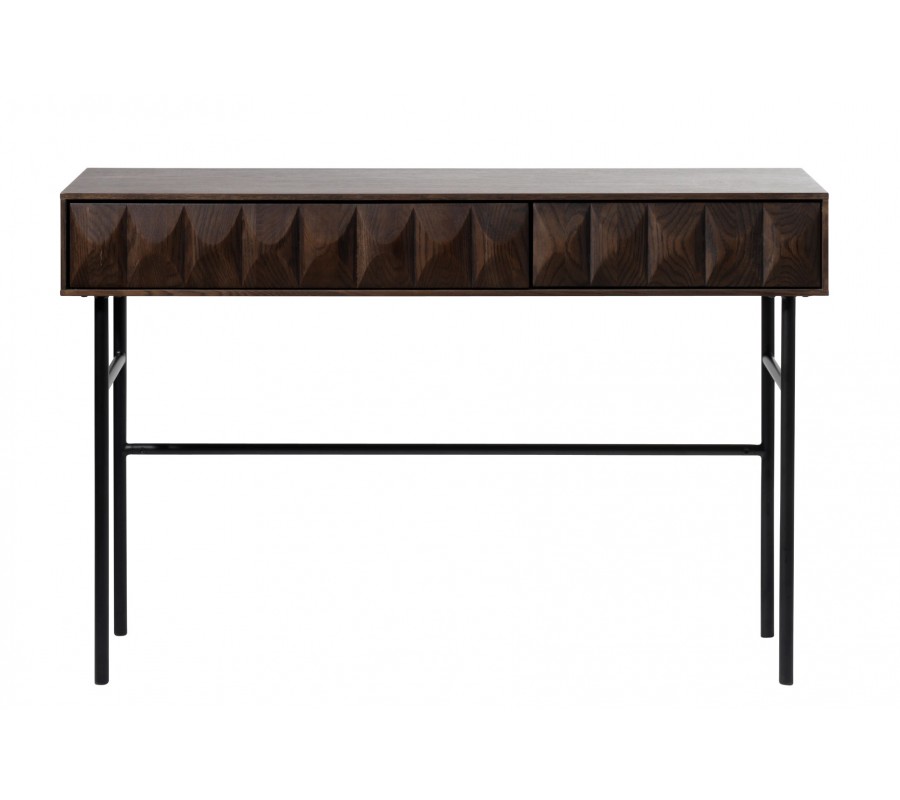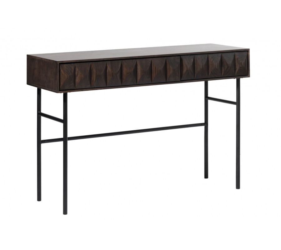 Moderný konzolový stolík Dopio z tmavého dubového dreva s dvomi zásuvkami s reliéfnym vzorom a čiernymi kovovými nohami 116 cm