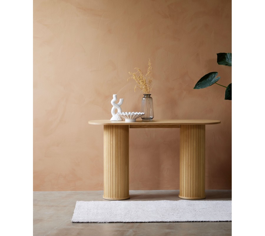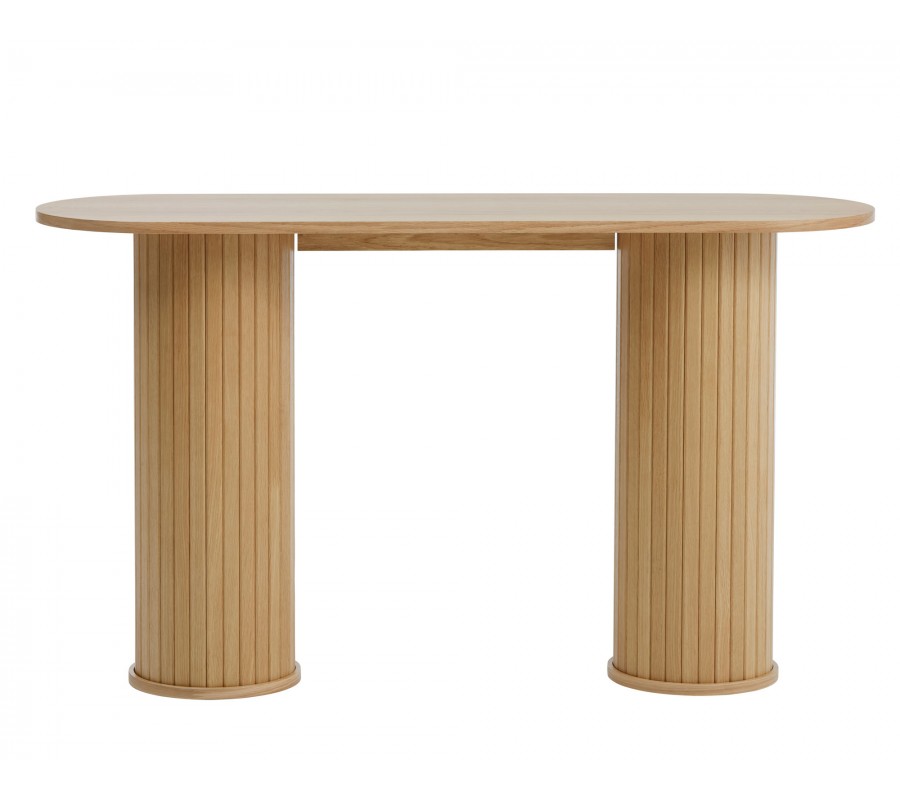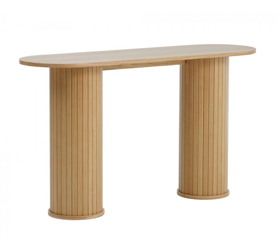 Škandinávsky oválny konzolový stolík Bornholm s lamelovými širokými nohami v svetlom hnedom dubovom prevedení 130 cm