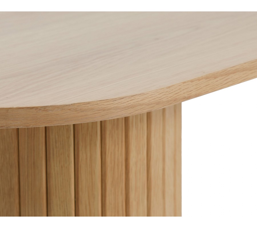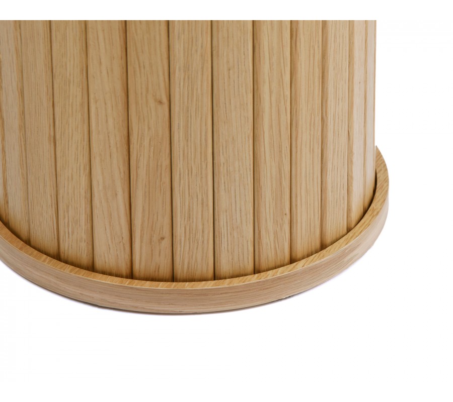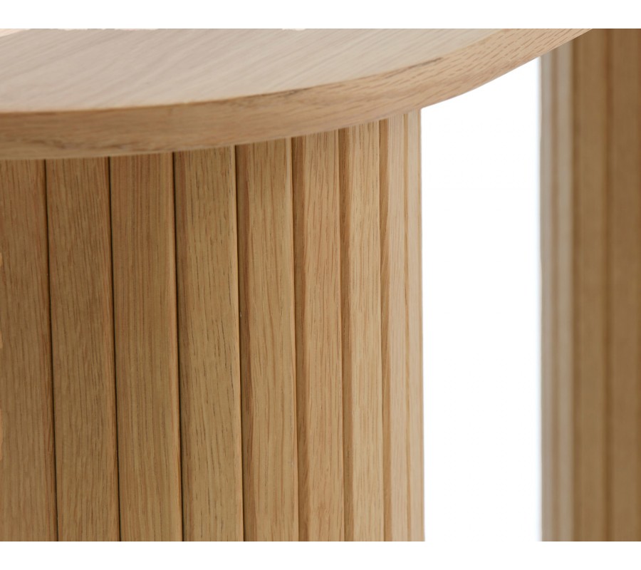 Stolík je vyrobený z kombinácie MDF a pravej dubovej dyhy. Povrch zdobí jemná kresba dreva, ktorú zvýrazňujetypické škandinávske naturálne svetlé hnedé prevedenie, vďaka čomu pôsobí nábytok útulne a prírodne.
