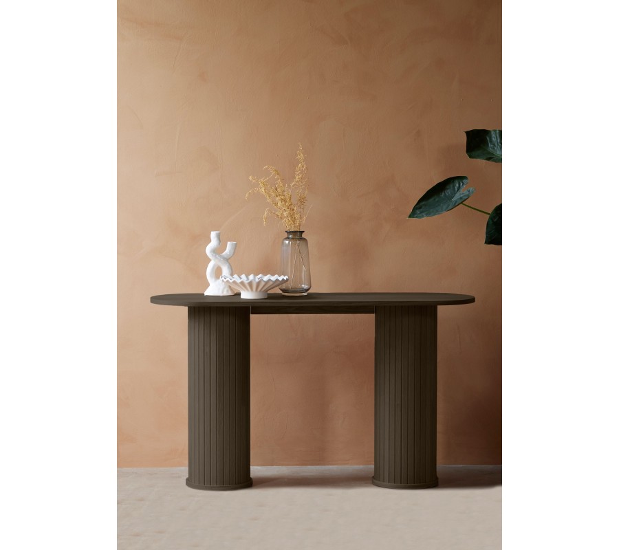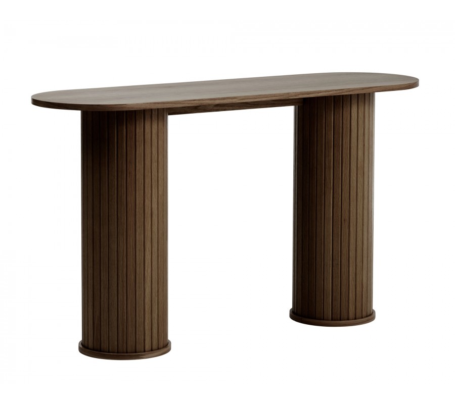 Retro tmavý hnedý dubový konzolový stolík Bornholm s oválnou doskou a valcovitými nohami s lamelovým reliéfom 130 cm