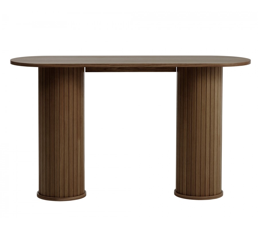 Silueta je jednoduchá dominujú v nej geometrické tvary. Vrchná doska má predĺžený oválny tvar s hladkým povrchom, na ktorom vyniká textúra dreva. Na stranách ju podopierajú dve široké valcovité nohy, dodávajúce nábytku monumentálny vizuál. Ich obvod je vykladaný vertikálnymi lamelami, inšpirovanými retro štýlom. Tvoria elegantný dekoratívny prvok a zároveň zachovávajú minimalistický vzhľad. Každá noha je v spodnej časti lemovaná okrúhlym rámom a v kombinácii so zvislou textúrou pripomína antický stĺp.