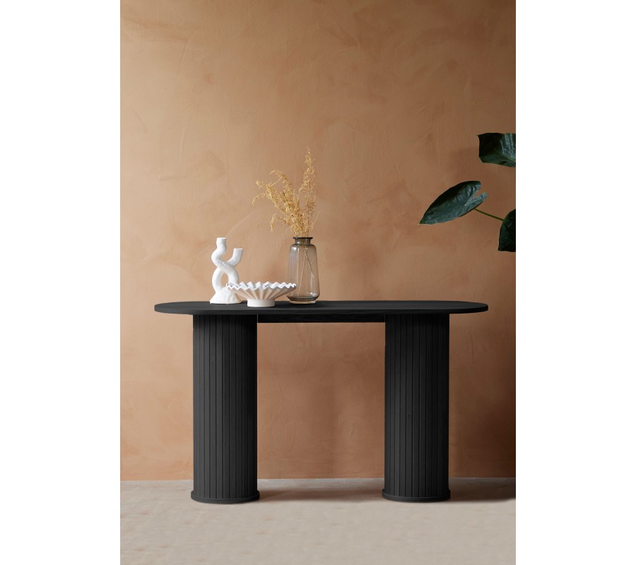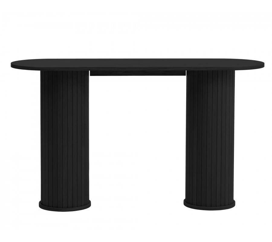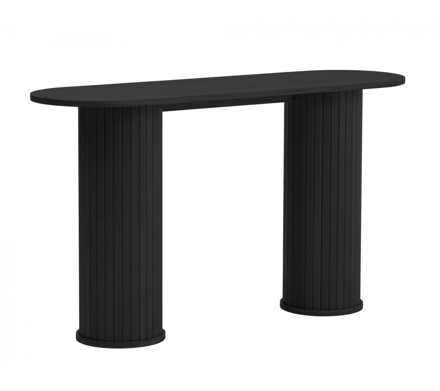 Moderný čierny konzolový stolík Bornholm s hladkou oválnou vrchnou doskou a dvomi mohutnými nohami s lamelovým reliéfom 130 cm
