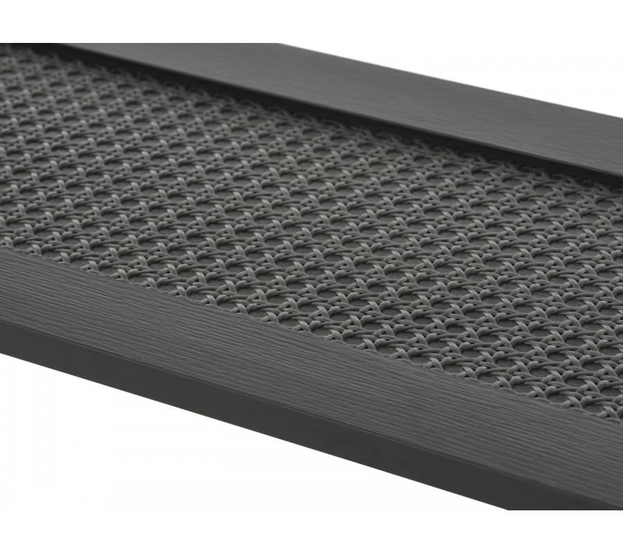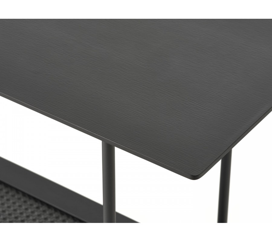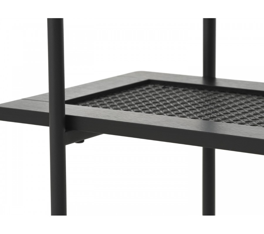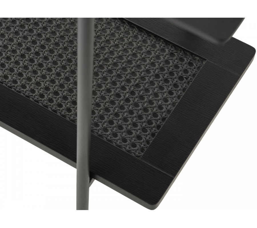 V spodnej časti sa nachádza praktická otvorená polica s dreveným rámom. Jej výplň tvorí ratanový výplet. Viedenský vzor prináša do dizajnu retro akcent a sofistikovaný dekoratívny detail. Nosná konštrukcia stolíka je z čierneho kovu, ktorý podčiarkuje industriálny štýl. Štyri štíhle valcovité nohy pôsobia elegantne a vzdušne, pričom zabezpečujú výbornú stabilitu. Prednú a zadnú časť prepája lineárna priečka nesúca policu, zatiaľ čo zadnú stranu dopĺňajú vo vrchnej časi dve diagonálne výstuhy.
