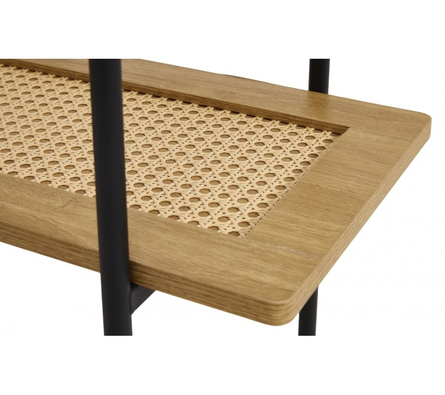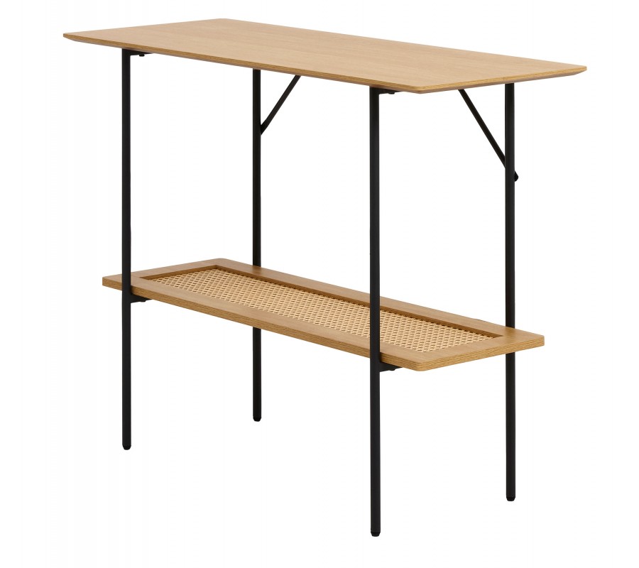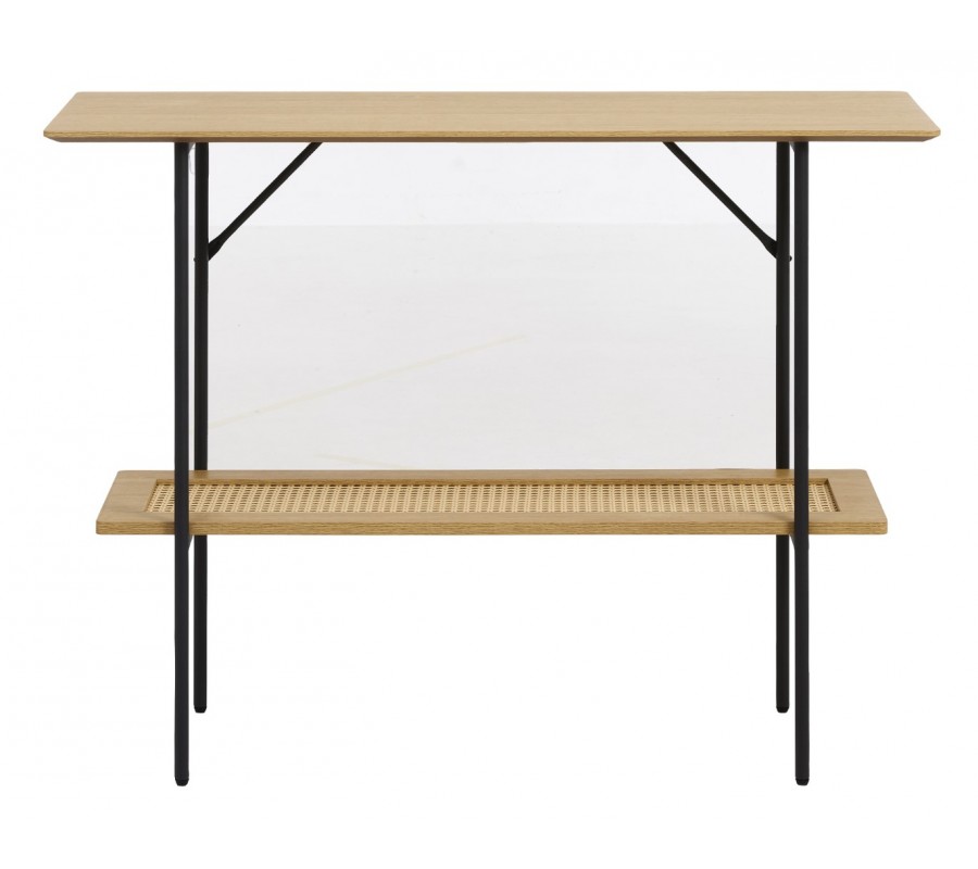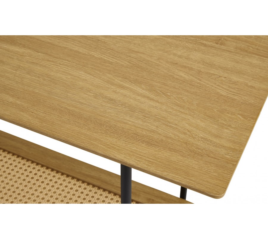 Moderný konzolový stolík Malmo so svetlou hnedou doskou s dubovým dekorom a ratanovou policou s čiernym kovovým rámom 100 cm