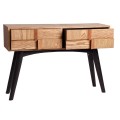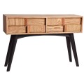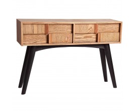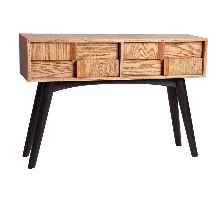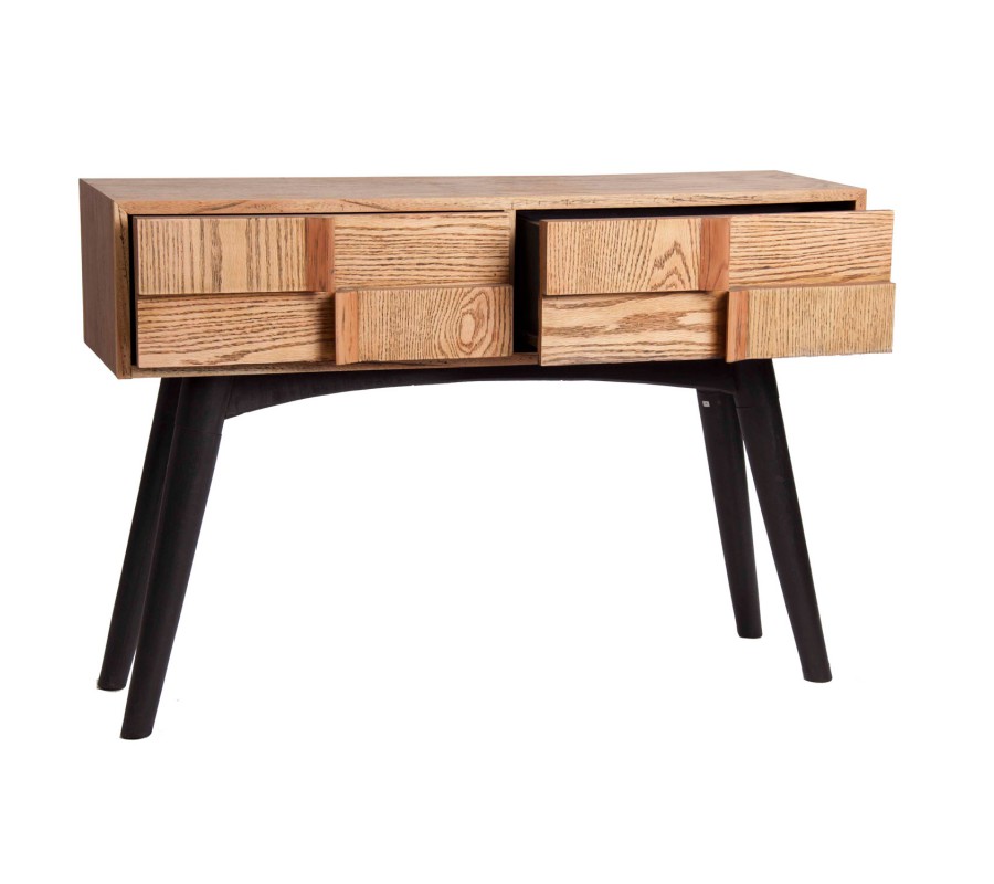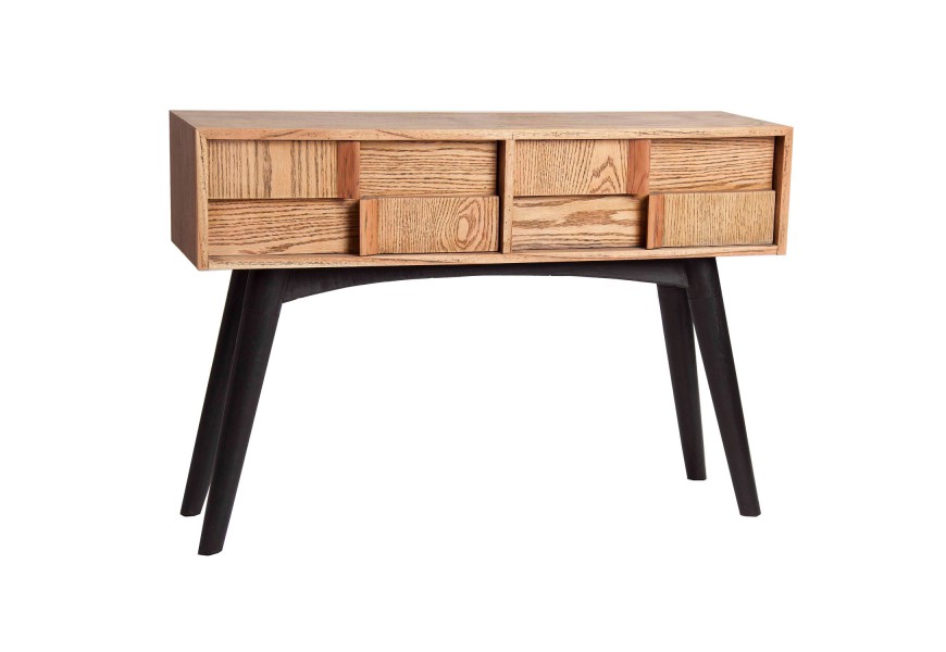 Konzolový stolík je vyrobený z dreva a má obdĺžnikovú vrchnú časť, obsahujúcu štyri zásuvky umiestnené po dvoch v dvoch radoch. Teplé hnedé farebné prevedenie s výraznou tmavšou kresbou letokruhov prinesie do priestoru pocit útulnosti a naturálny element. Vrchná doska a boky sú hladké, zatiaľ čo predné strany zásuviek sú mierne zošikmené, čo vytvára geometrický vizuál inšpirovaný art deco štýlom. Každá zásuvka má v strede vysunutú vertikálnu úchytku, ktorá ju opticky predeľuje na dve časti. Dizajn je tak funkčný a zároveň esteticky nápaditý.
