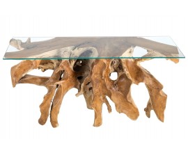 Luxusný masívny konzolový stolík Root s organickou nohou z hnedého teakového dreva a sklenenou doskou 150 cm