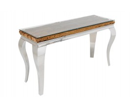 Luxusný glamour konzolový stolík Modern Barock s chrómovou konštrukciou a doskou z hnedého masívneho dreva a skla 145 cm