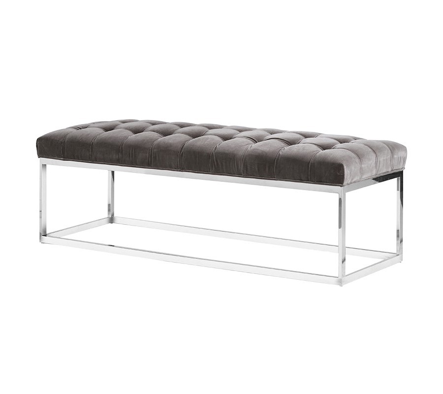 Art-deco luxusná lavica Nouvel v šedom prevedení má čalúnený povrch. Povrch tvoria gombíky, je hladká a jemná na dotyk. Celkovo je pohodlná na dlhé sedenie, vďaka mäkkému podsedáku. Nosnú konštrukciu tvoria chrómové nohy, ktoré majú na spodu priestor pre ukladanie vecí. Má prešívané gombíky typické pre štýl chesterfield. Perfektne sa hodí do šatníka, predsiene, hlavne na odkladanie obuvi a posedenie pri obúvaní. Pôsobí elegantne a určite zapadne do Vášho interiéru.