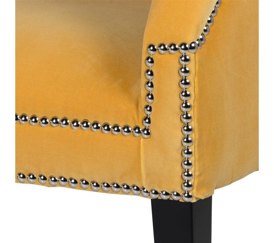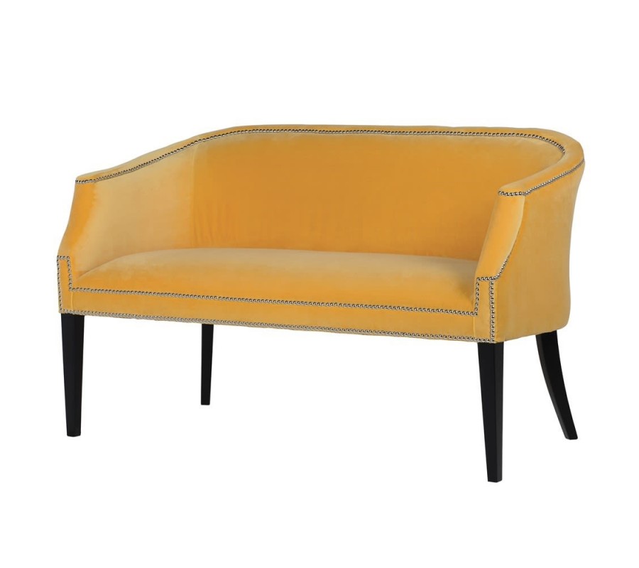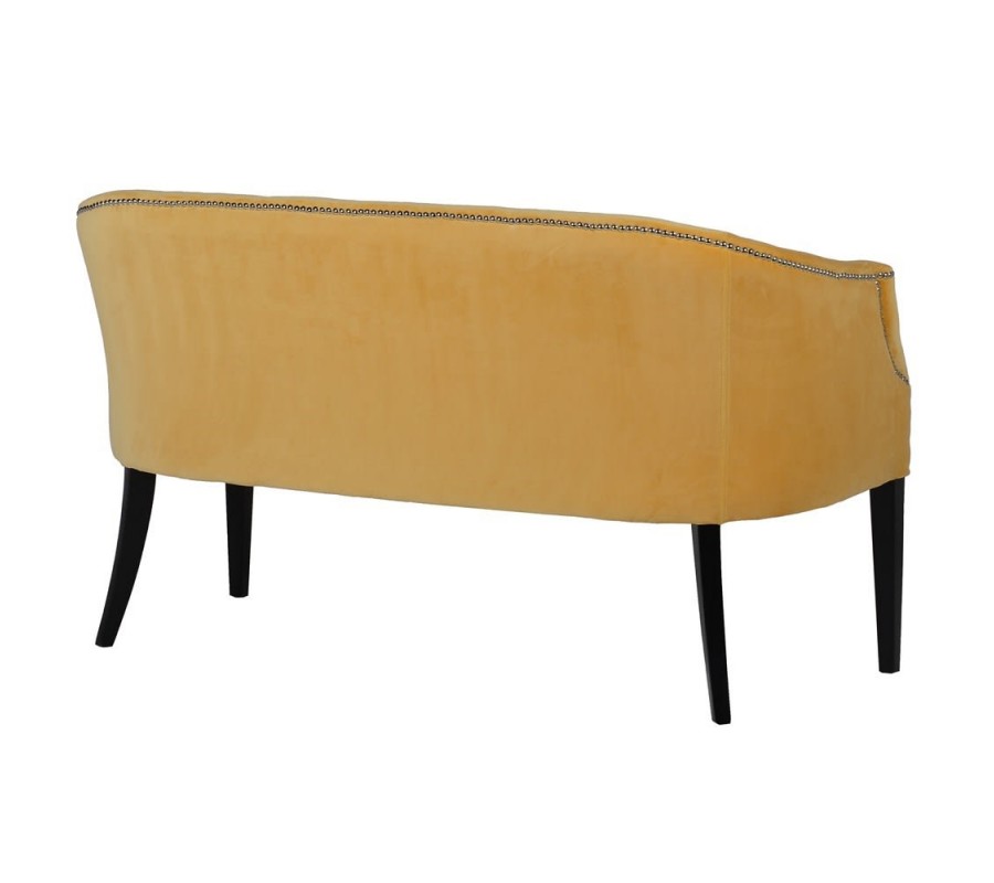 Jedinečná lavica Aldea je zaujímavým kúskom, ktorý sa nesie v dnes veľmi populárnom art-deco štýle. Na prvý pohľad zaujme najmä svojou výraznou horčicovo-žltou farbou, vďaka ktorej sa vo vašom interiéri stane dominantným kúskom. Svojím čalúnením a vytvarovaným operadlom i opierkami na ruky sa postará o vaše dokonalé pohodlie. K žltej farbe vytvárajú kontrastnú kombináciu tmavohnedé nožičky z masívneho dubového dreva, ktoré pôsobia luxusne a zaručujú stopercentnú stabilitu. Lavica Aldea disponuje zaujímavými kovovými aplikáciami, ktoré jej taktiež dodávajú dizajnový a exkluzívny vzhľad. Skvelo vynikne najmä v kombinácii s čiernou, tmavohnedou, bielou či zelenou farbou.