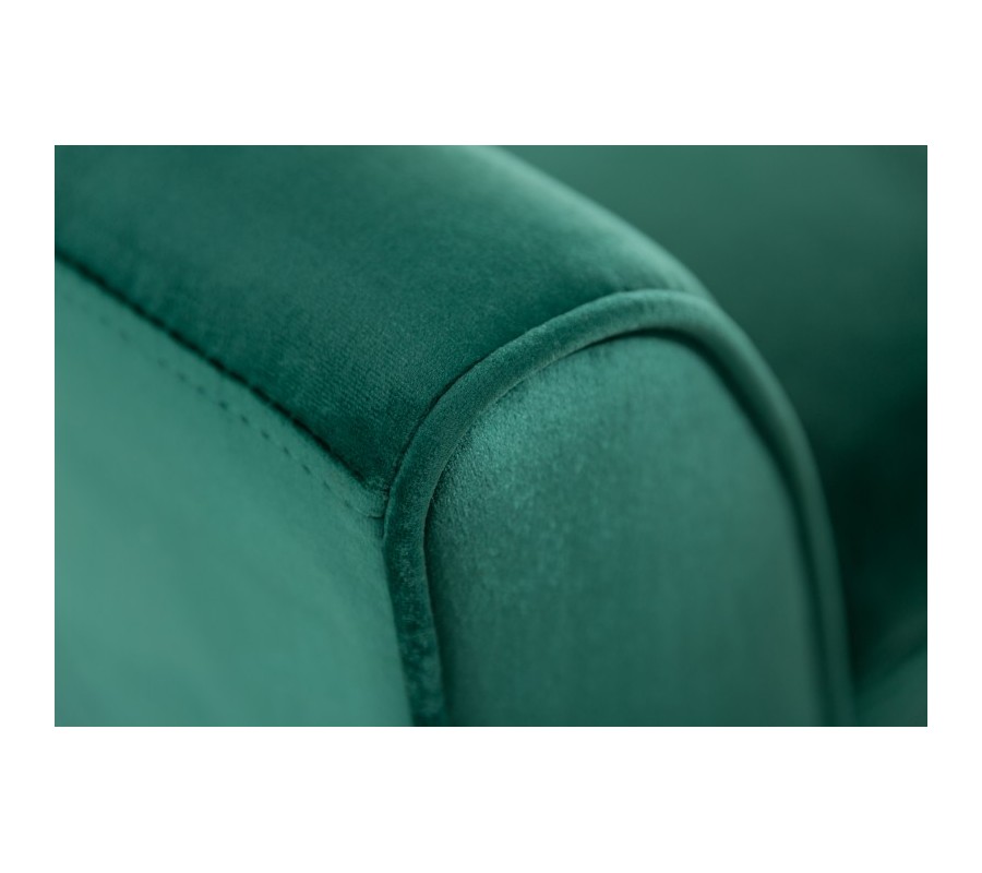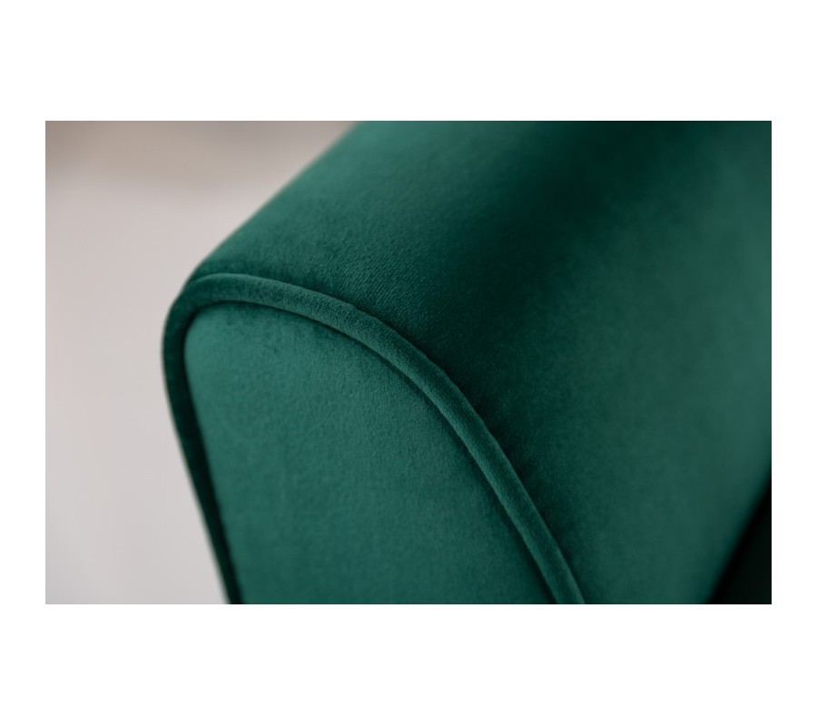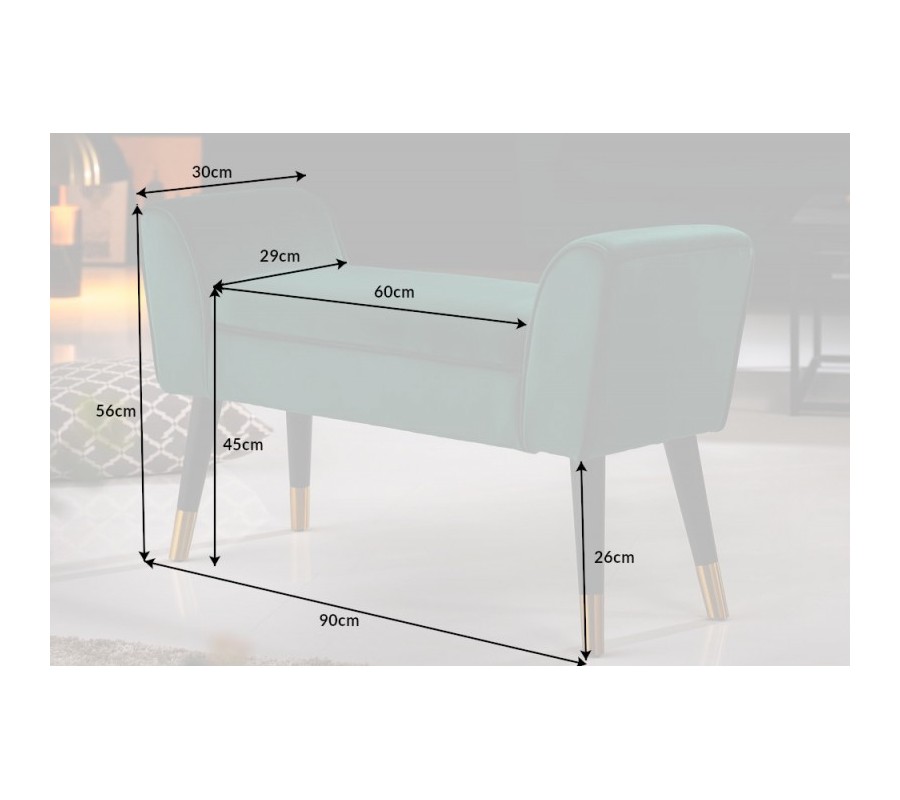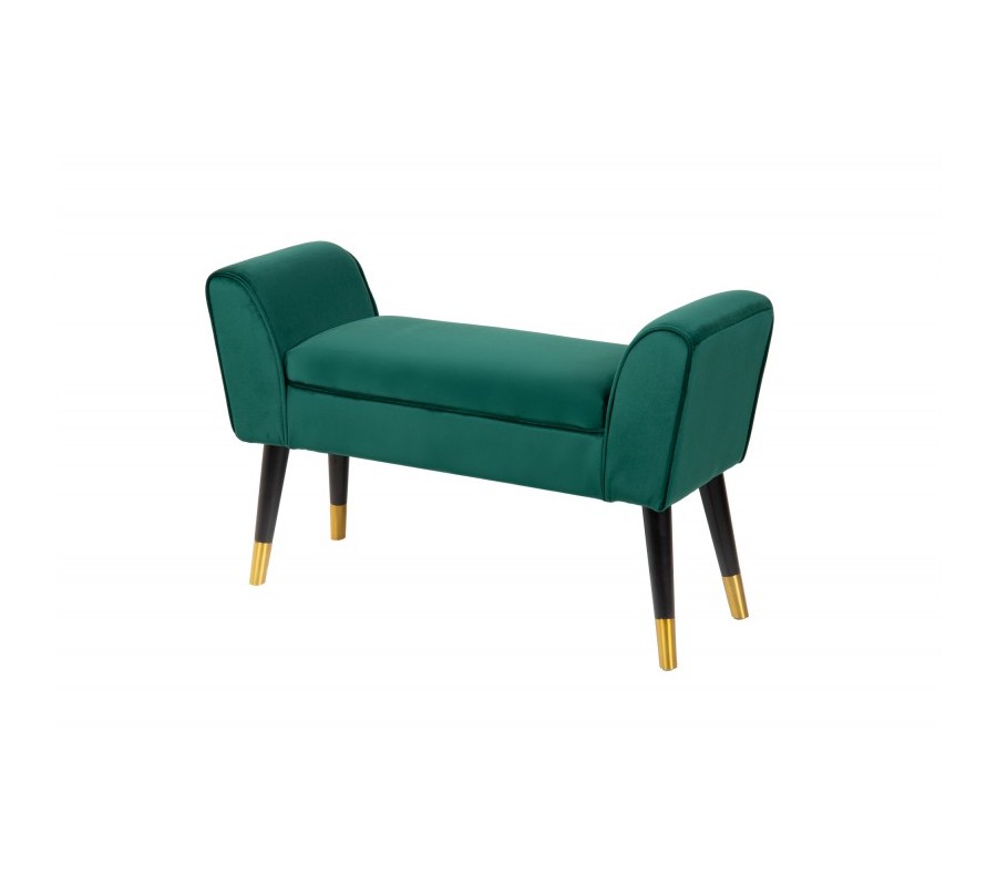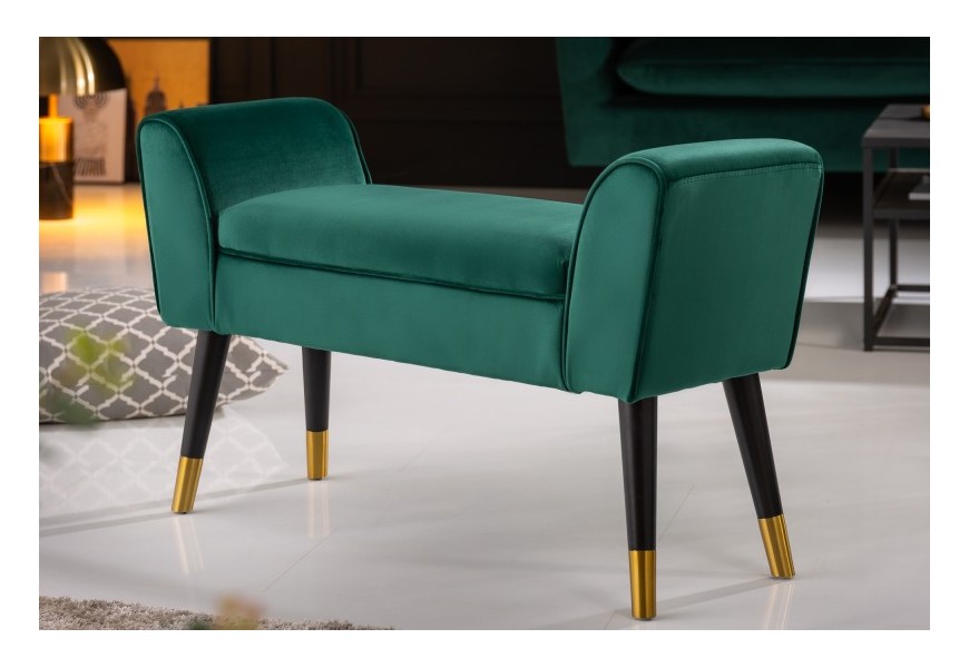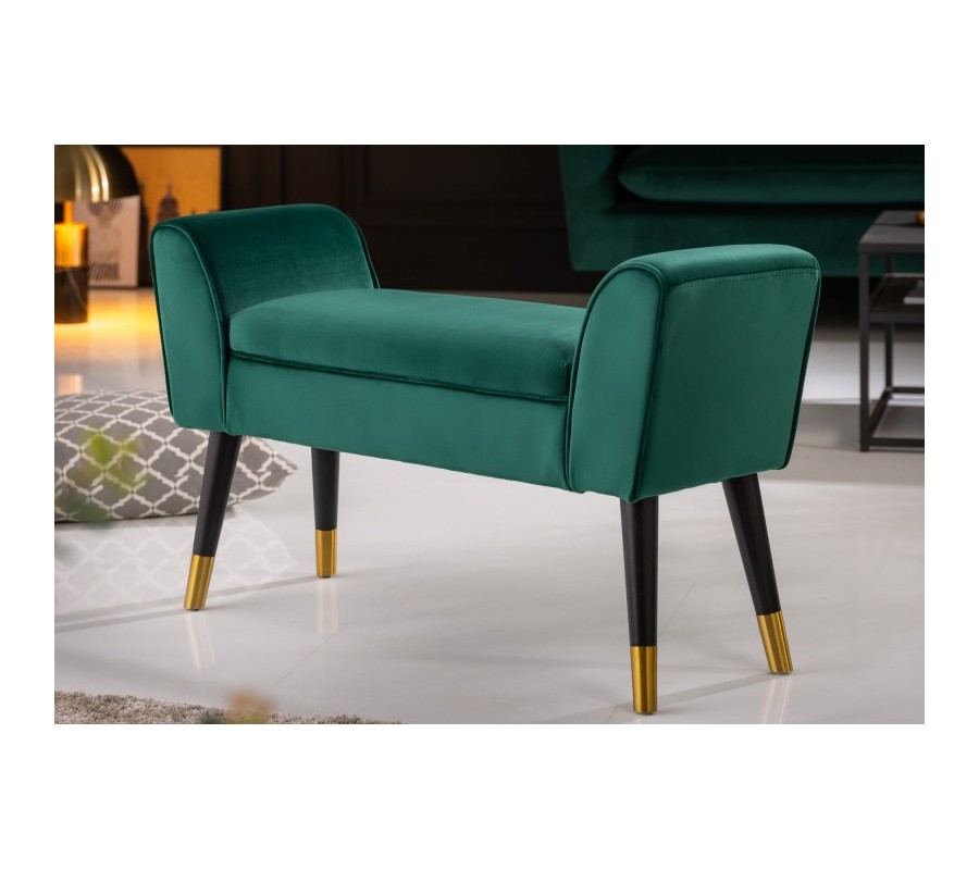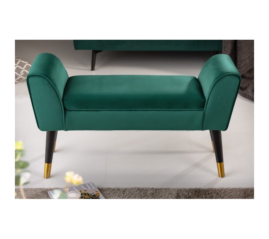 Dizajnová lavica Karen je kúskom, ktorý zapadne do všetkých moderne ladených interiérov. Jej art-deco vzhľad je dosiahnutý kombináciou zamatového poťahu v zelenej farbe s drevenými zlatými nožičkami. Pre pohodlnejšie sedenie disponuje lavica dvomi bočnými opierkami. Hodí sa predovšetkým do tmavšie zariadených interiérov v mdoernom či art-deco štýle. Odporúčame lavicu Karen doladiť k čalúnenej sedačke, masívnemu drevenému nábytku a doplniť kovovými dekoráciami.