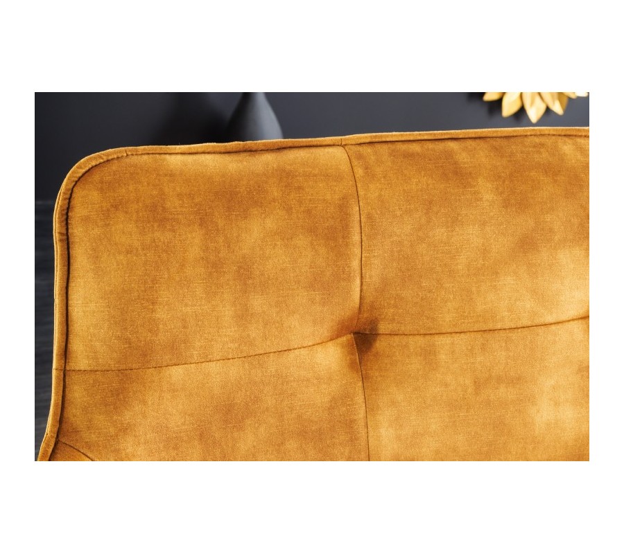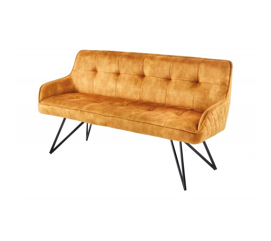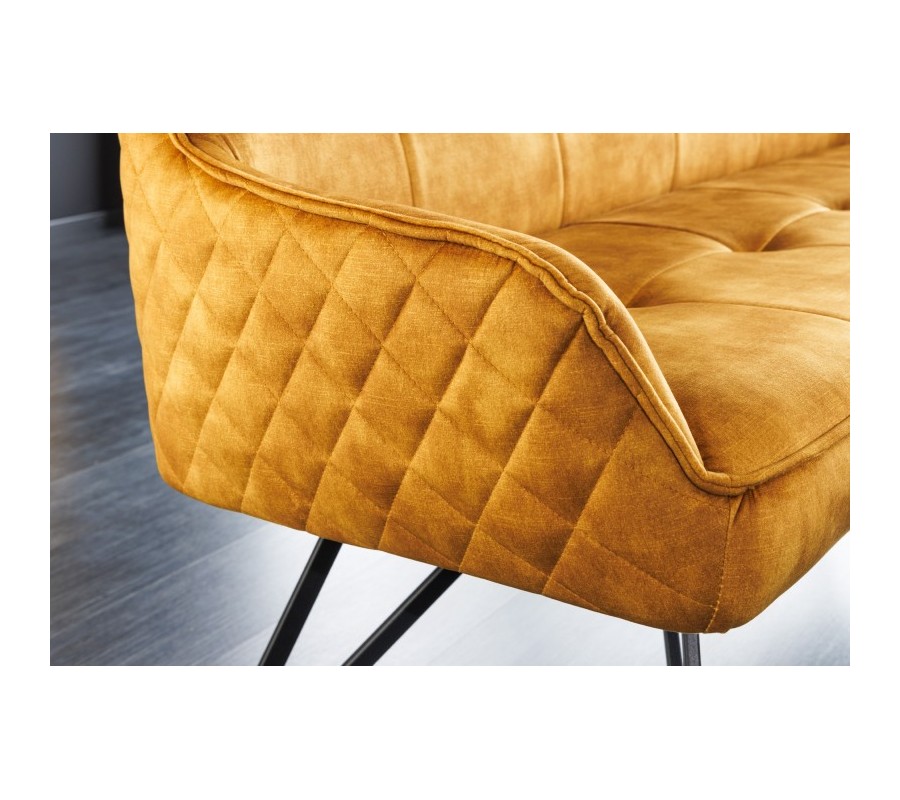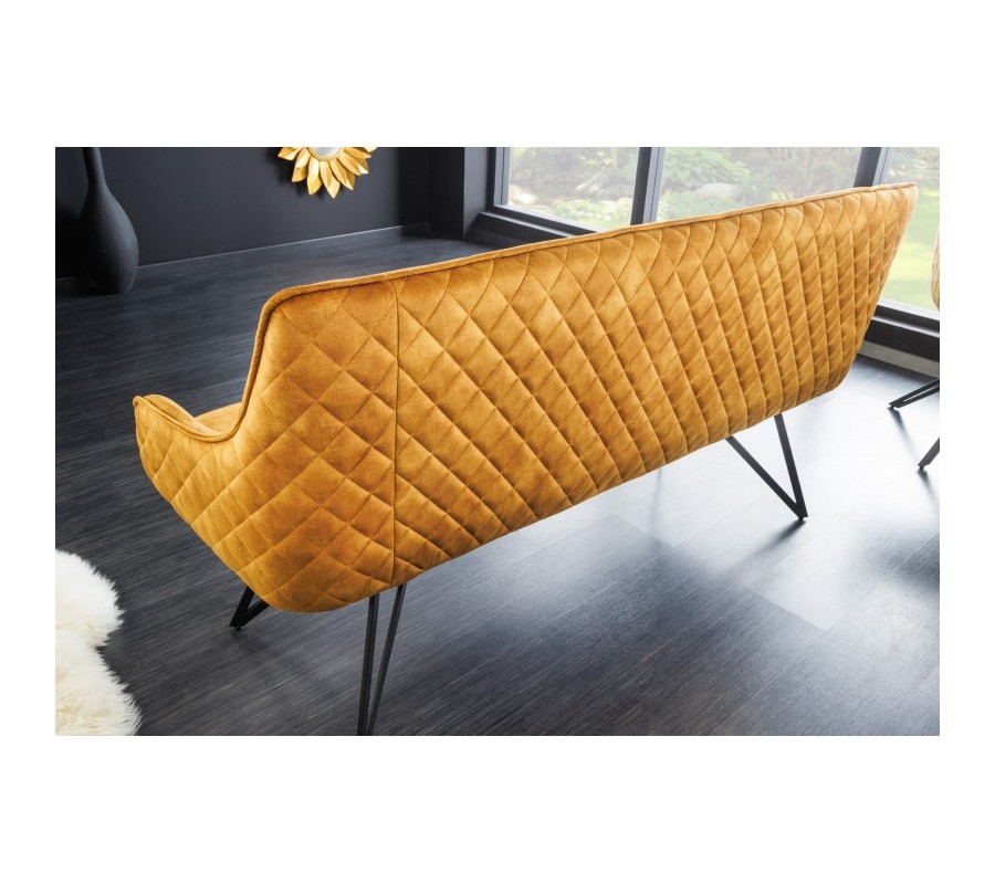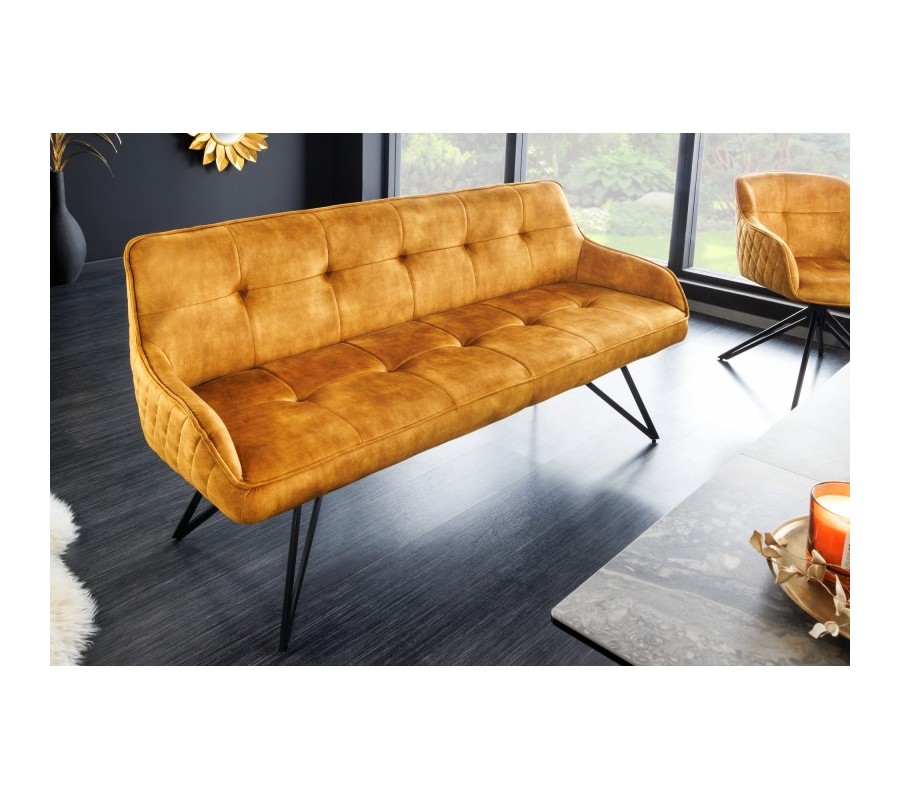 Dizajnová lavica Dunelon krásne rozžiari váš interiér. Tento štýlový kúsok s jemným retro nádychom sa vyznačuje predovšetkým svojím výrazným horčicovožltým čalúnením zo zamatu, ktoré sa postará nielen o svieži a pútavý vzhľad, ale aj o váš dokonalý komfort pri sedení. Jemmy prešívanie zdobí celý poťah a dotvára jeho retro vzhľad. K tomu do dizajnu vnášajú jemný industriálny nádych mierne zošikmené čierne nožičky z kovu zabezpečujúce pevnosť a stabilitu. Lavica Dunelon vkusne doplní priestory obývačiek, jedální či predsiení, rovnako ako aj reprezentatívnych priestorov hotelových recepcií, firiem či štýlových reštaurácií. Vďaka svojmu pútavému vzhľadu zapadne do retro ale i industriálne ladených interiérov ladených v tmavých odtieňoch, kde krásne vynikne výrazná horčicovožltá farba!
