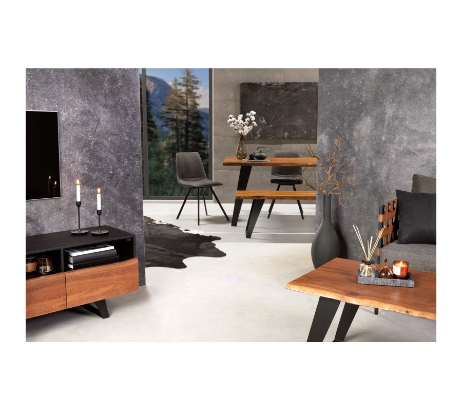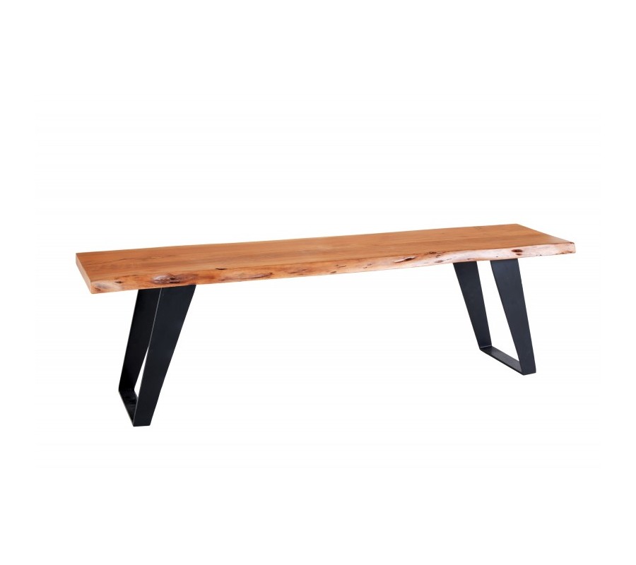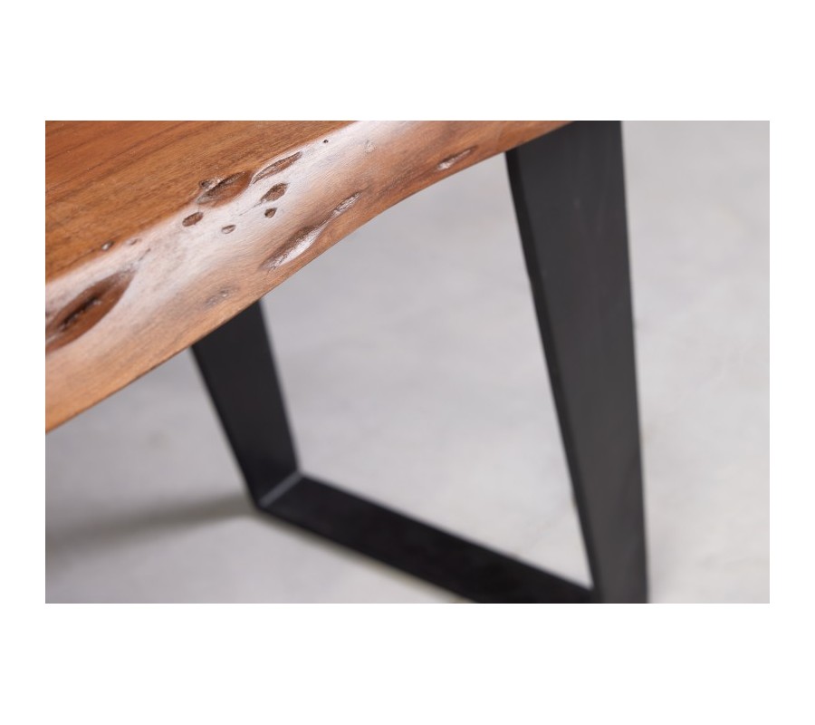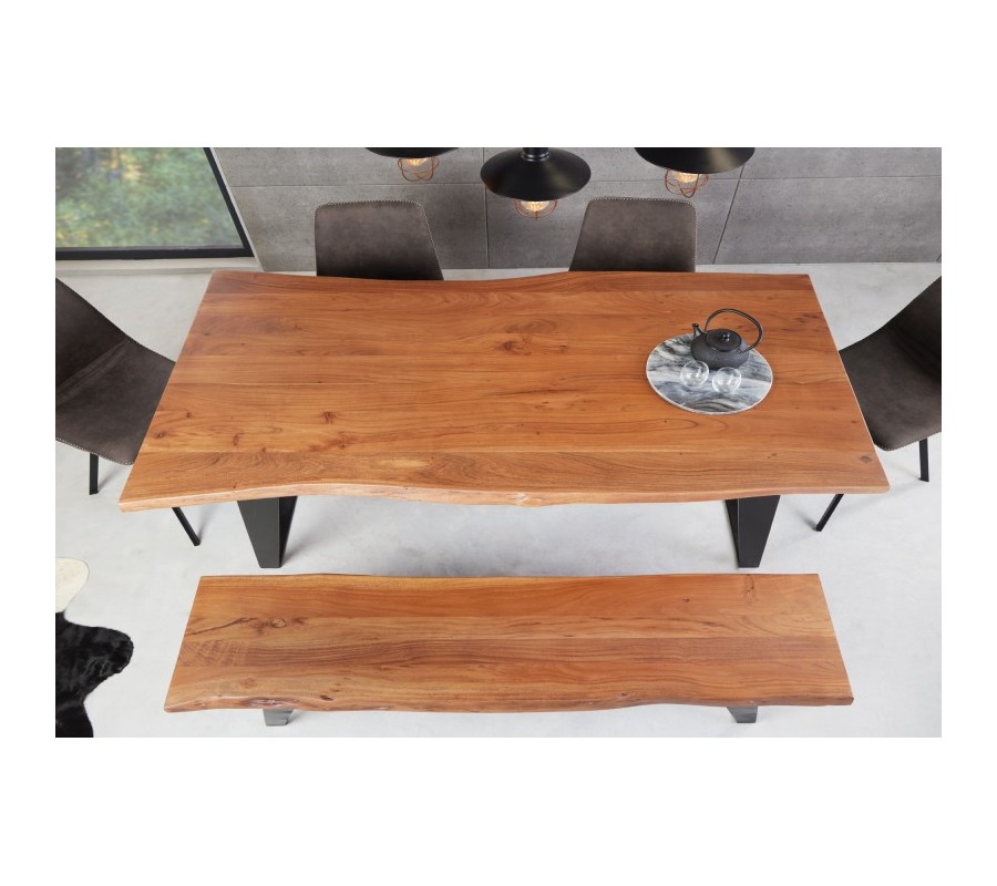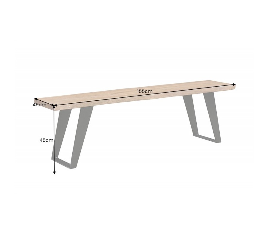 Elegantná masívna lavica z kolekcie Mammut vás poteší okrem nadčasového dizajnu svojim kvalitným spracovaním. Je vyrobená z kvalitného akáciového dreva v prírodnej hnedej farbe, pričom ju zdobí originálna kresba dreva a nepravidelný okraj kmeňa stromu. Akáciová vrchná doska s hrúbkou 3,8cm stojí na kovovej konštrukcii a mohutných šikmých nohách v tmavo sivej antracitovej farbe s matným finišom, ktoré sú prepojené v spodnej časti, a tak zabezpečujú dokonalú stabilitu a pevnosť. Industriálna lavica Mammut sa výborne hodí do industriálne ladených jedální spolu s jedálenským stolom Mammut z našej ponuky. Svoje miesto si nájde aj v spoločnosti masívneho nábytku v podobe komody s dvierkami na drevenných nožičkách v prírodnej farbe či pri komode s presklenými časťami. Lavica disponuje kompaktnými rozmermi, a tak na ňu pohodlne usadíte 3 osoby. Farebné prevedenie lavice Mammut vynikne v kombinácii s neutrálnymi zemitými odtieňmi hnedej, zelenej, škoricovej či béžovej. Ku lavici je vhodné doladiť industriálne doplnky v podobe lustra geometrických tvarov či svietnika s lanovým úchytom.