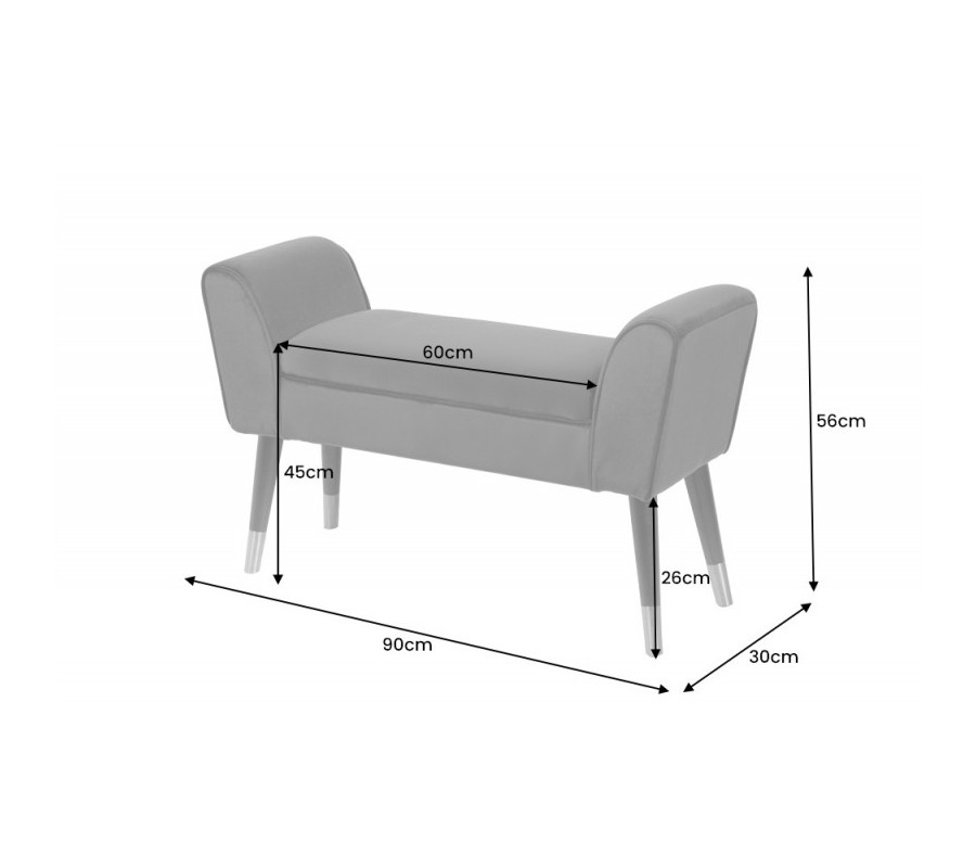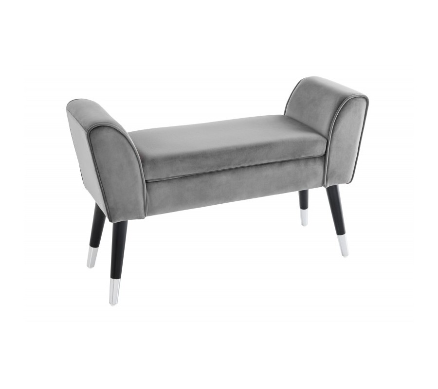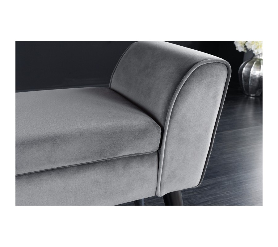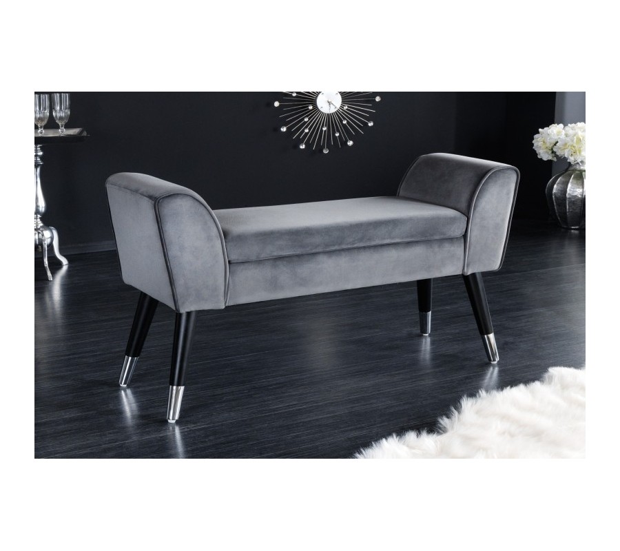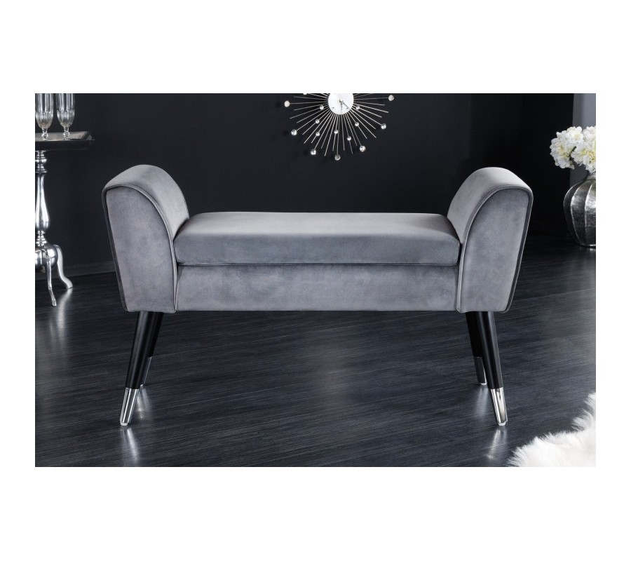 Dizajnová lavica Karen krásne doplní priestory moderne i art deco zariadených interiérov. Pozostáva zo sedacej časti čalúnenej príjemnou zamatovou látkou v tmavosivej farbe, ktorú dopĺňajú kovové čierne nožičky. Nožičky sú zároveň zdobené striebornými prvkami vytvárajúcimi glamour elegantný efekt. Pre pohodlnejšie sedenie disponuje lavica dvomi bočnými opierkami. Hodí sa predovšetkým do tmavšie zariadených interiérov, kde dotvorí luxusný vzhľad. Odporúčame lavicu Karen umiestniť do predsiení či vstupných hál, svoje miesto si však nájde aj v spálňach či hosťovských miestnostiach. Pre zvýraznenie art deco štýlu vyskúšajte doplnky z kovu či skla v striebornej farbe.