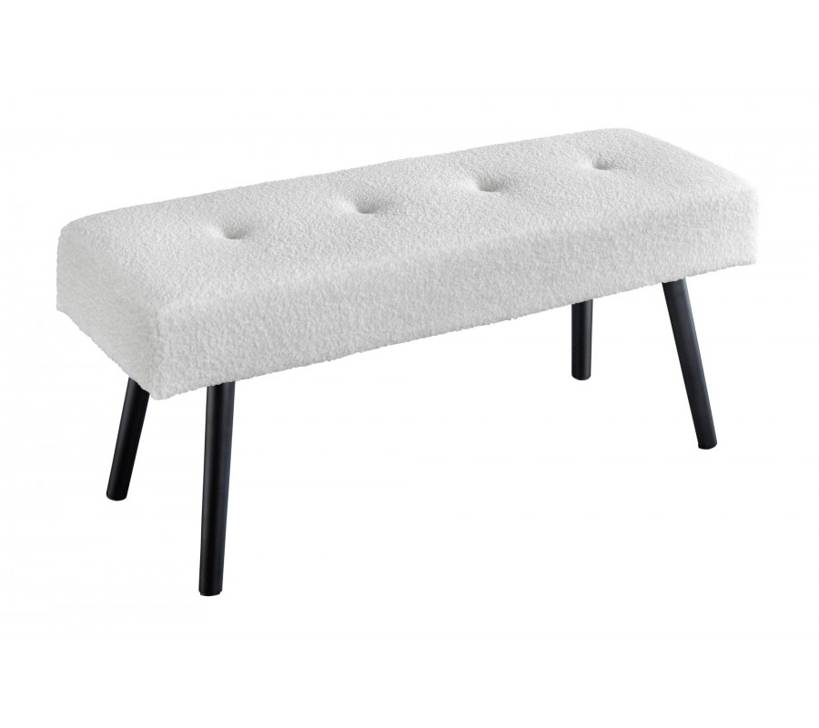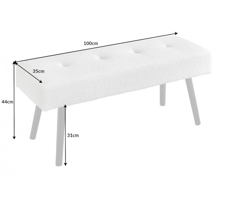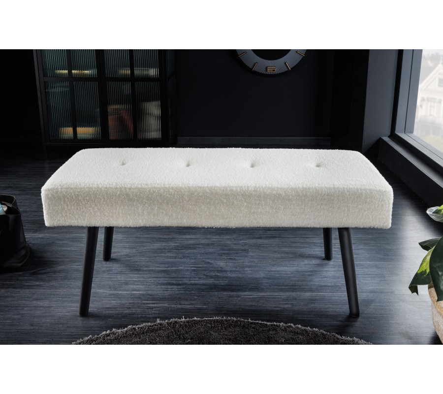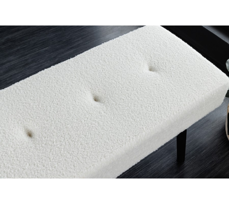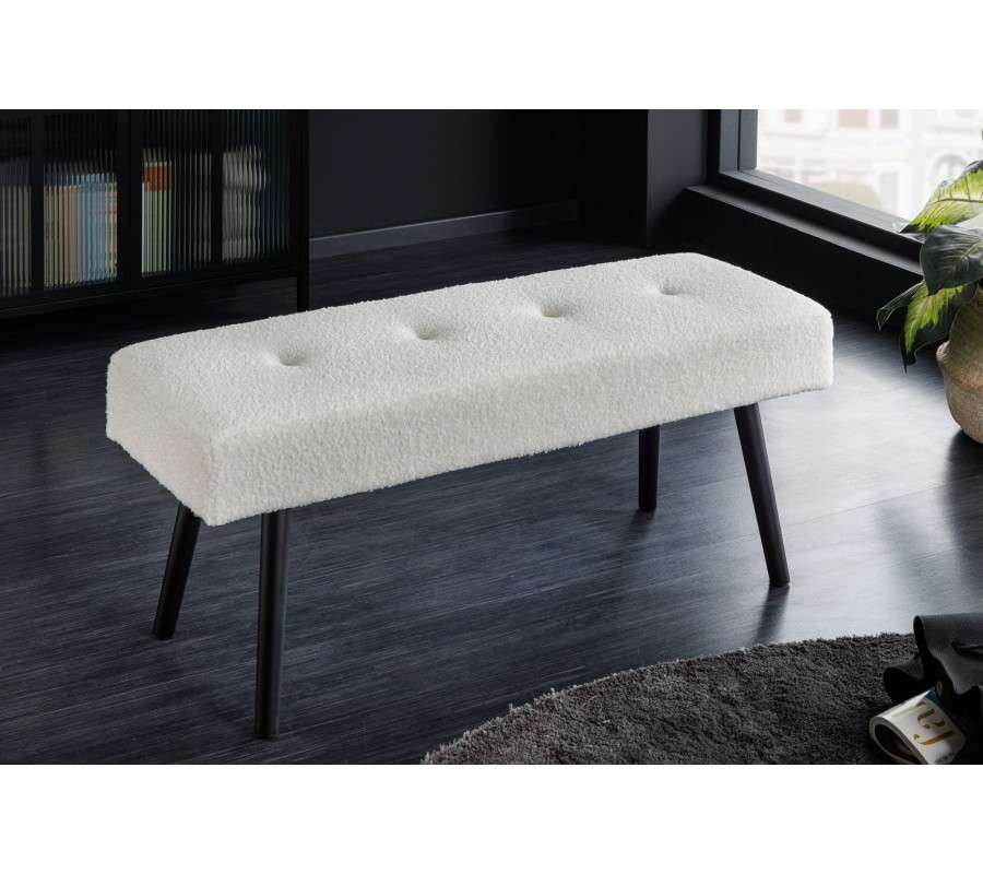 Stabilitu a odolnosť lavice zaručujú štyri nožičky z kovu s čiernym práškovým nástrekom. Ich výška 31 cm a nosnosť až do 120 kg zabezpečujú, že lavica bude pevná a zároveň elegantná. Tento industriálny prvok perfektne dopĺňa jemnosť bieleho buklé čalúnenia, čím sa lavica stáva univerzálnym kúskom vhodným pre kombináciu s moderným, alebo napríklad aj s industriálnym nábytkom, napríklad s kolekciou Industria Durante alebo Industria Negra.