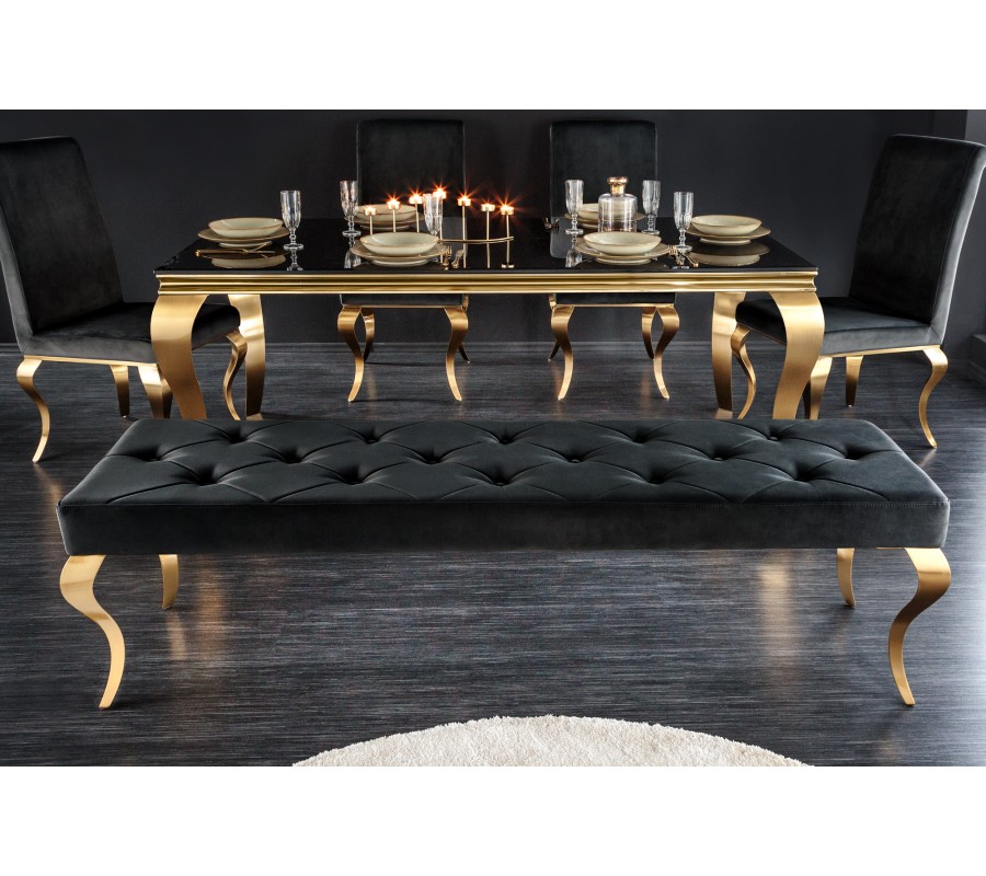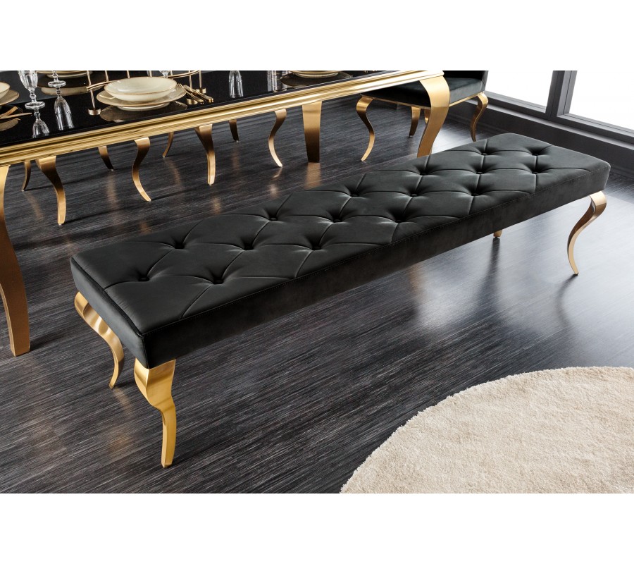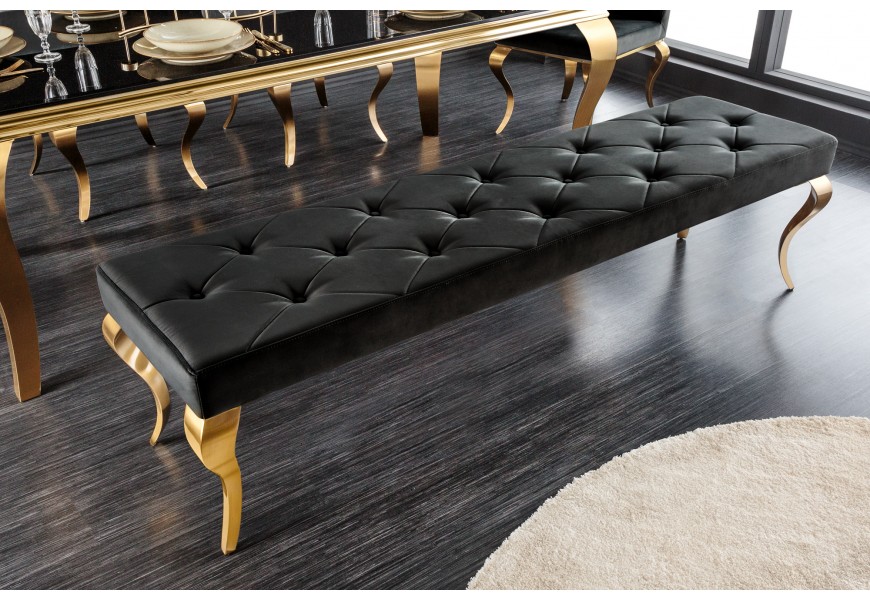 Luxusná jedálenská lavica Modern Barock s čiernym zamatovým čalúnením a zlatými nožičkami z kovu 172cm