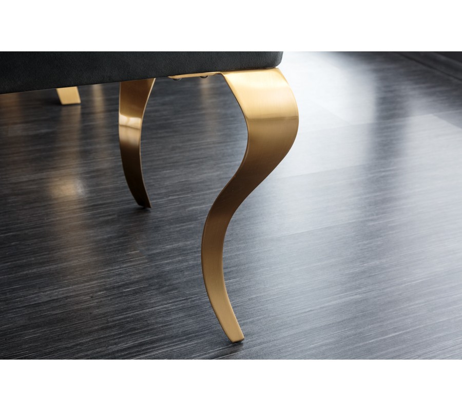 Luxusná jedálenská lavica Modern Barock doladí váš interiér a vnesie doň luxusný nádych. Tento kúsok je ideálnym doplnkom moderne ladených priestorov s nádychom barokového štýlu, ktorý sa nesie aj celým dizajnom lavice. Disponuje štýlovým zamatovým poťahom v čiernej farbe, ktorý dopĺňa chesterfield prešívanie. Príjemný materiál a mäkké polstrovanie sa postarajú o váš dokonalý komfort pri stolovaní, príci či poobednom posedení s priateľmi. Celkový dizajn dopĺňajú mohutné kovové nohy žiarivej zlatej farby, ktoré svojím elegantným zaoblením efektívne dopĺňajú barokový vzhľad. Lavica Modern Barock vytvorí dokonalú kombináciu s rovnomennými jedálenskými stoličkami a so zlatým kovovým či skleneným stolom. Pre umocnenie barokového nádychu tiež odporúčame aj ďalšie kúsky z kolekcie Modern Barock.