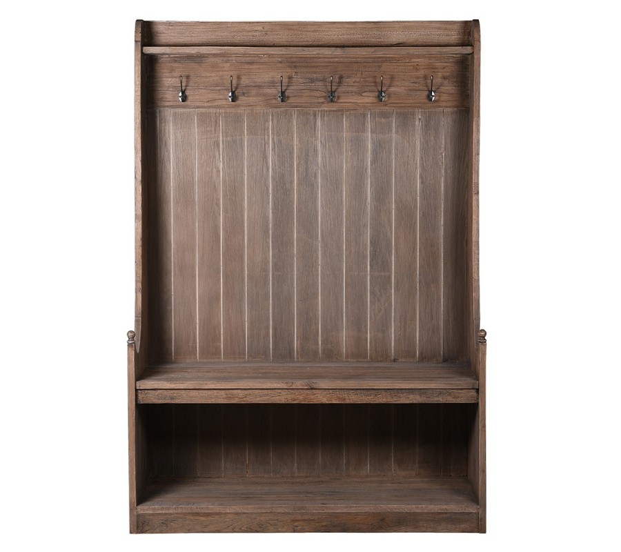 Luxusná vidiecka predsieňová lavica Woody z masívneho dubového dreva so šiestimi vešiakmi a dvoma poličkami 184cm