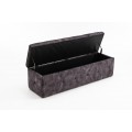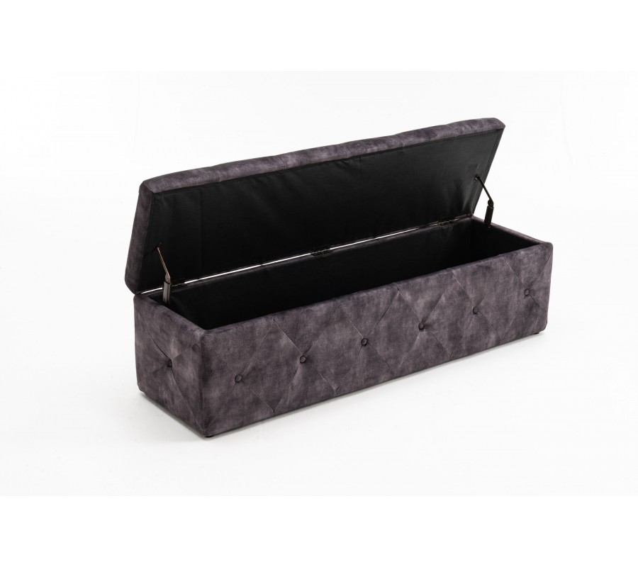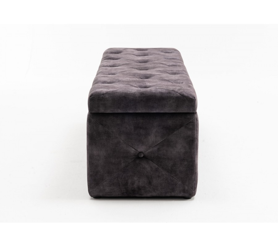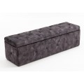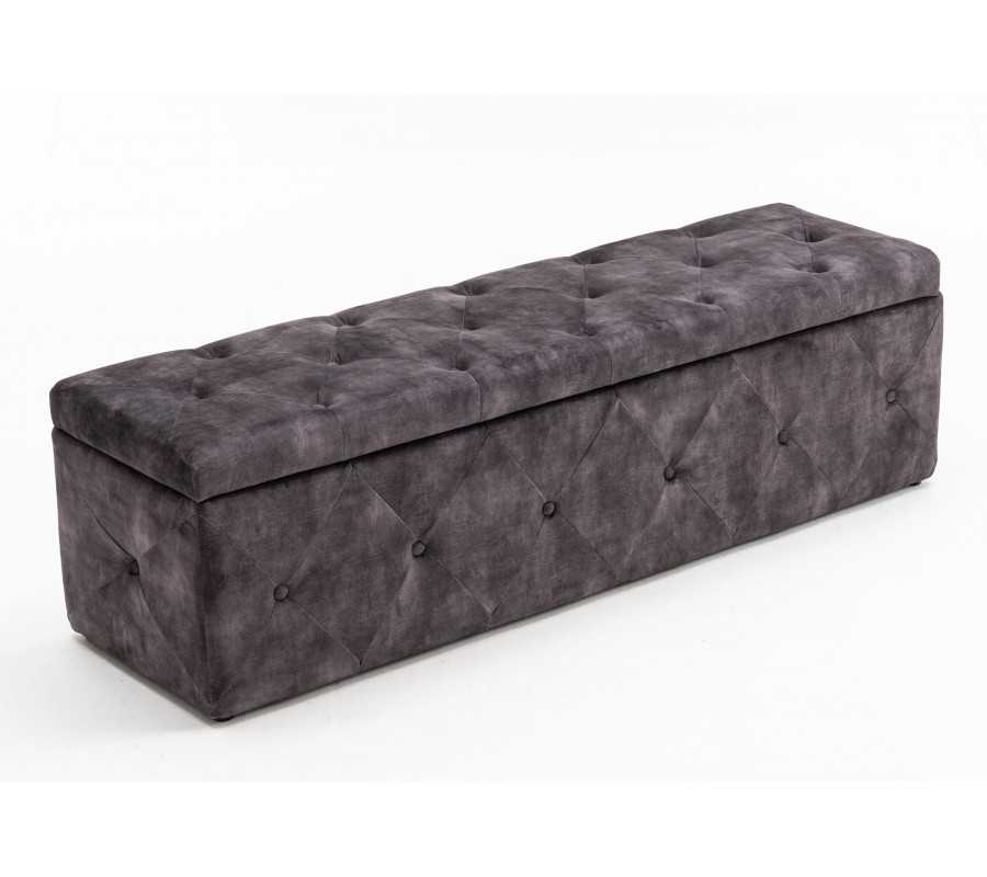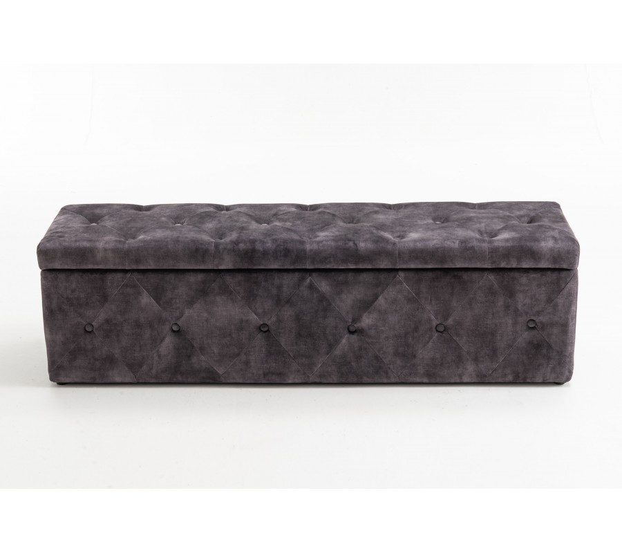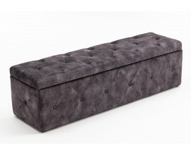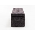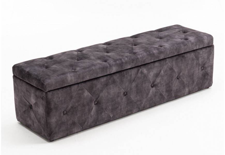 Moderná sivá lavica Caledonia s úložným priestorom a zamatovým prešívaným čalúnením v chesterfield štýle 140 cm