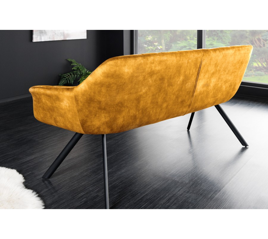 Dizajnová čalúnená horčicovo žltá lavica Mariposa s opierkou a zamatovým poťahom 165 cm