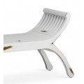 Biela lavica Forja sa nesie vo vintage štýle vďaka svojej povrchovej úprave, ktorá nadobúda starožitný vizuál. Bočné strany lavice sú mierne vyvýšené a zakrivené. Ich dizajn sa skladá z drevených mriežok, ktoré poskytujú oporu pri sedení pre dvoch ľudí. Úzke nožičky lavice sú taktiež mierne zakrivené.