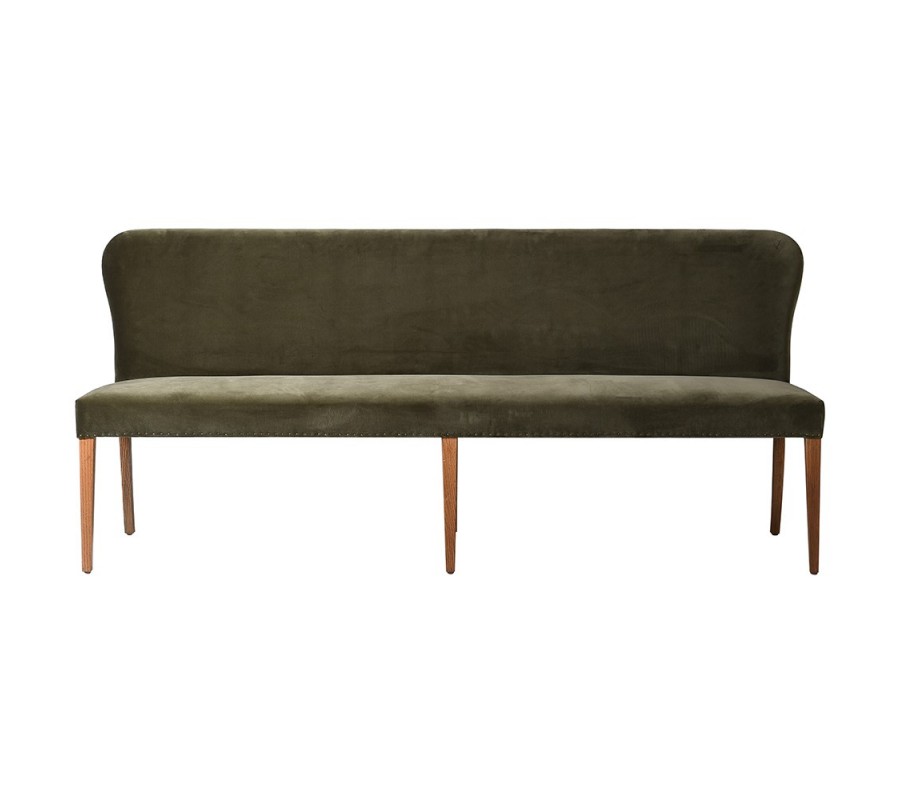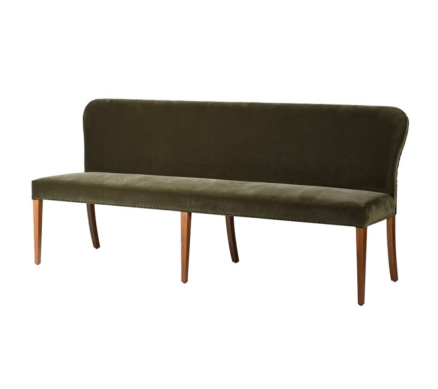 Luxusná klasická jedálenská lavica Grace so zamatovým olivovo zeleným poťahom a hnedými dubovými nožičkami 200 cm