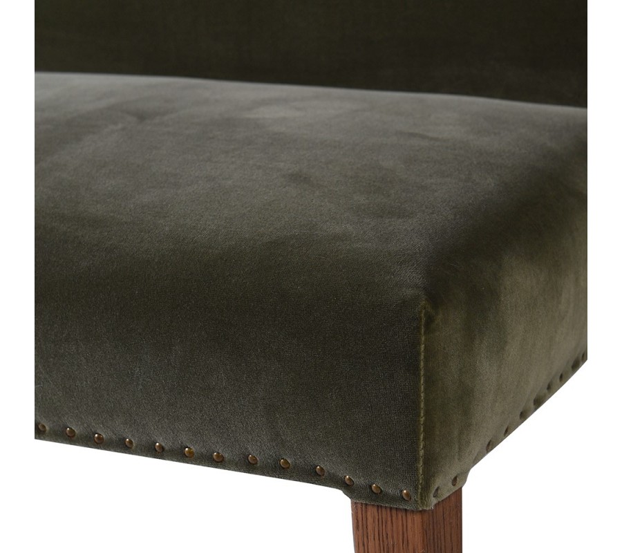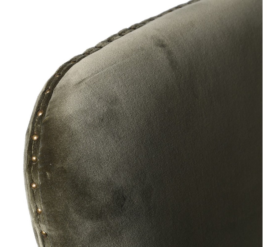 Sedadlo aj opierka sú čalúnené, s mäkkou penovou výplňou. Pohodlie zvyšuje na dotyk príjemný zamatový poťah z mikrovlákna. Tento materiál je veľmi odolný a nenáročný na údržbu. Jeho olivová zelená farba pôsobí sofistikovaným dojmom a výborne ju dopĺňa vybíjané zdobenie okrúhlymi nitmi na obvode opierky a v spodnej časti sedadla. Zlatý metalický akcent je subtílny, no vyzdvihuje jemný lesk zamatu a dodáva nábytku dotyk luxusu.