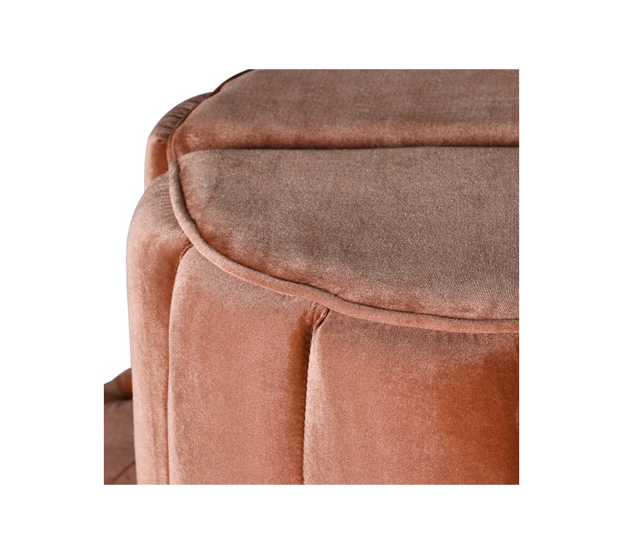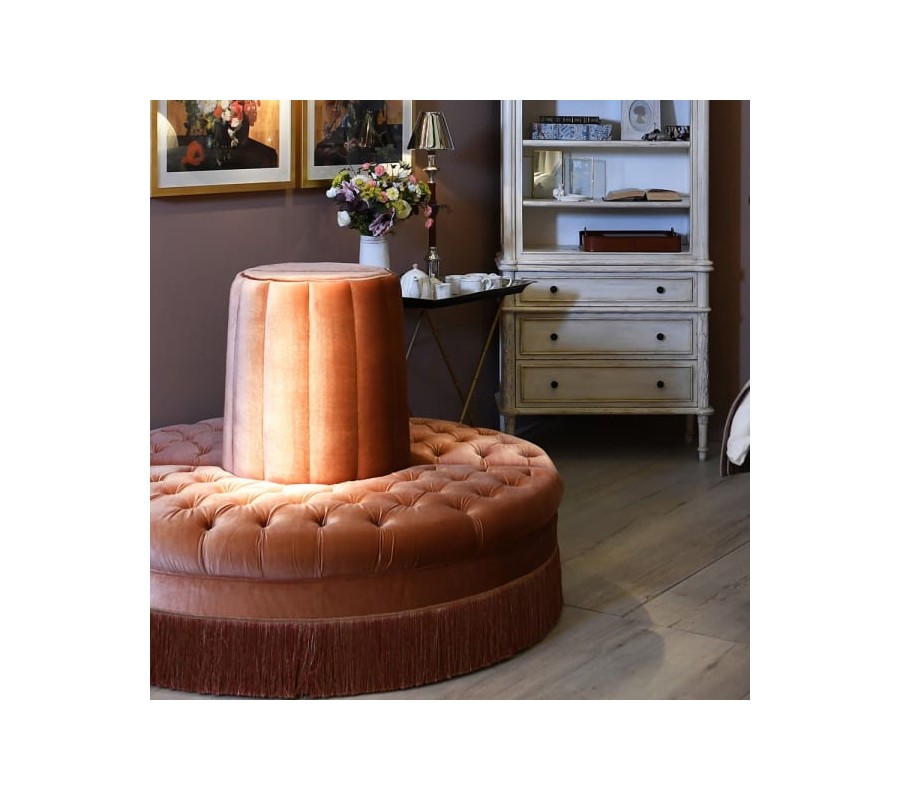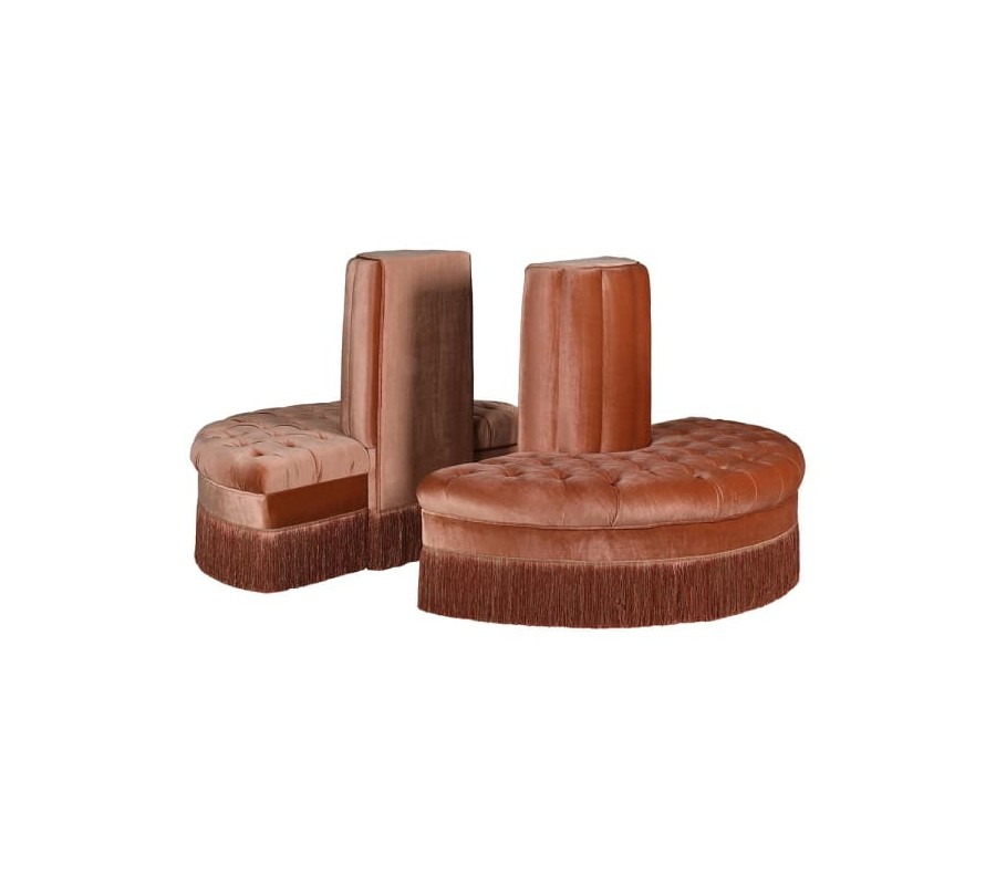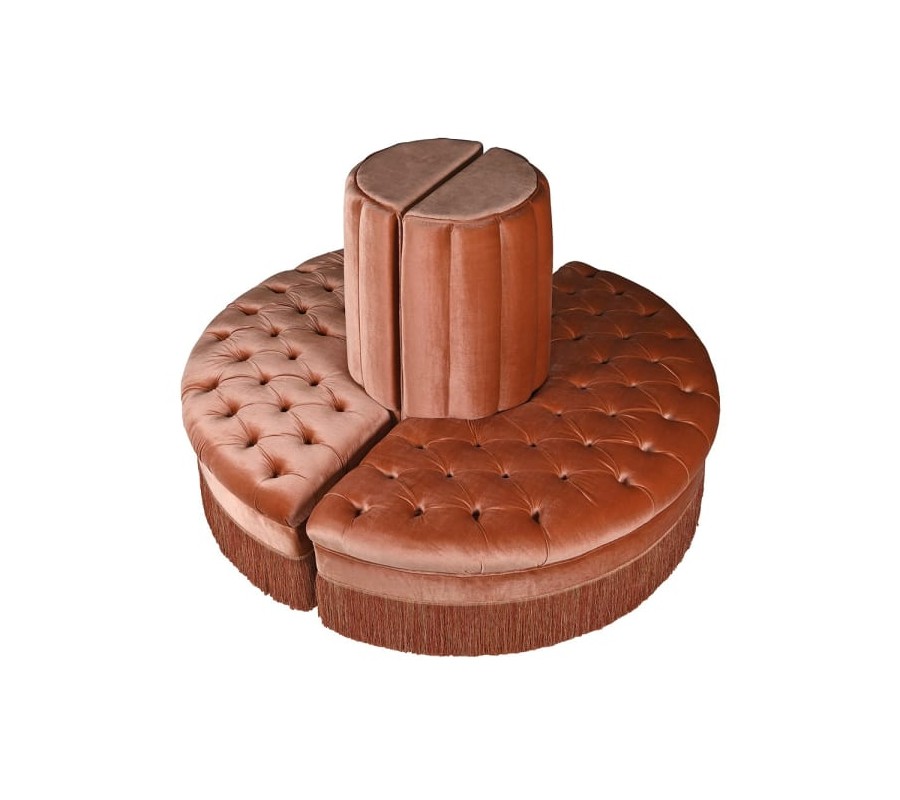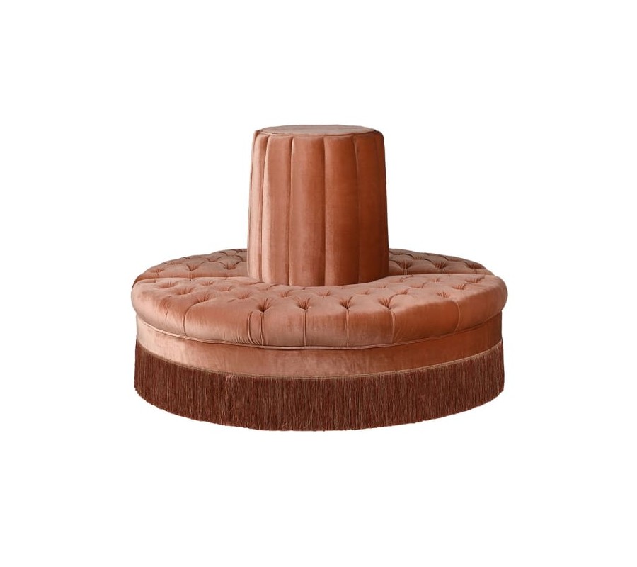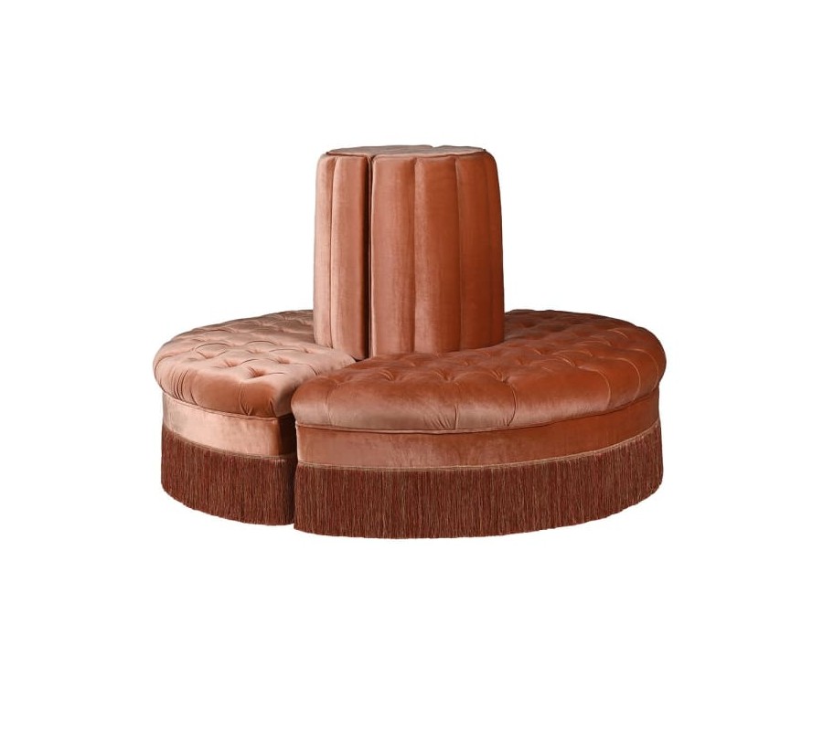 Lavica Florence predstavuje elegantný a výnimočný dizajnový prvok. Má okrúhly tvar. Pozostáva zo stredového čalúneného stĺpca a dvoch samostatných polkruhových častí, ktoré vytvárajú pohodlné sedenie. Povrch je pokrytý zamatovým poťahom v teplej tehlovo-oranžovej farbe. Sedacia časť je zdobená gombíkovým prešívaním, čo jej dodáva sofistikovaný vzhľad.