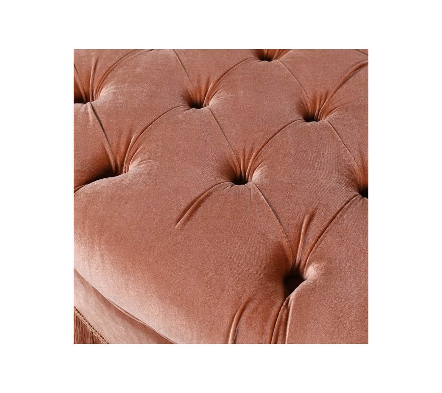 Spodná časť lavice je zdobená dekoratívnym strapcovým lemovaním, ktoré zvýrazňuje jej luxusný charakter. Povrch je jemný na dotyk, zamatová štruktúra dodáva pocit komfortu a elegancie.