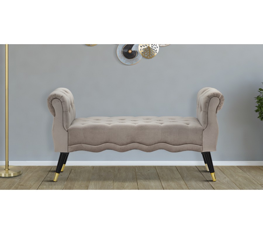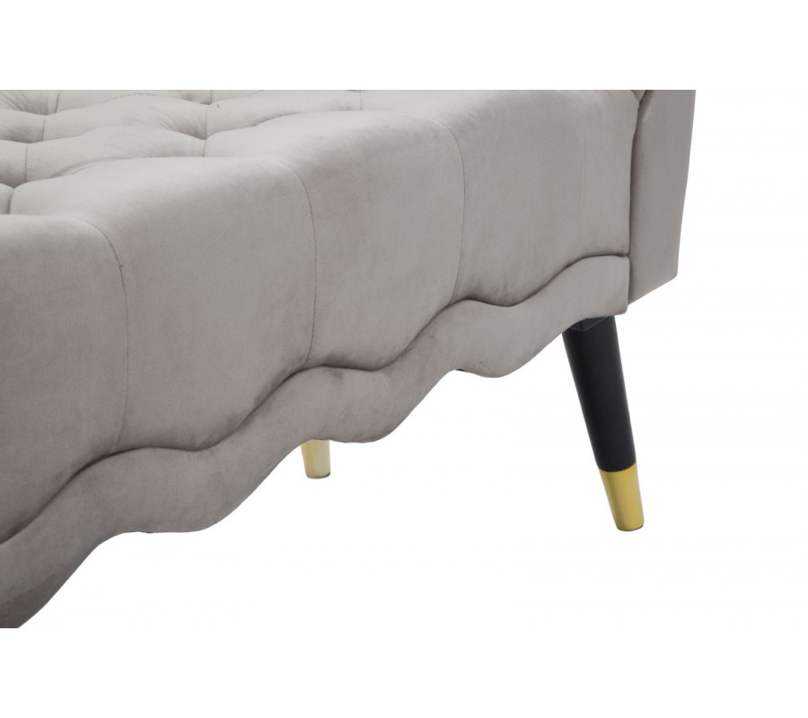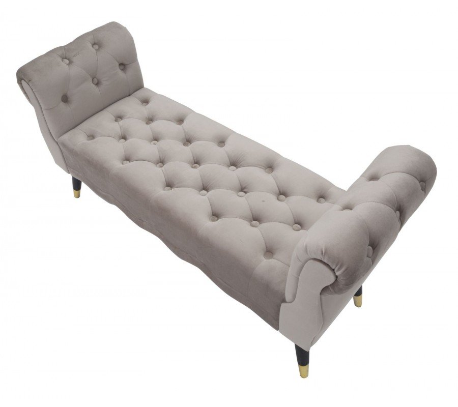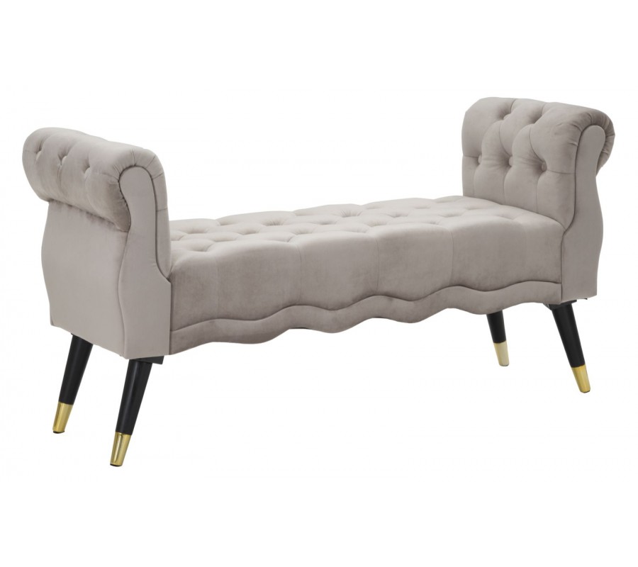Lavica má pevnú drevenú konštrukciu, so zošikmenými nožičkami v čiernej farbe. Sú ukončené kovovým detailom v metalickom zlatom prevedení, ktoré dodáva dizajnu jemný art deco nádych. Na sedacej časti je konštrukcia obalená mäkkým penovým čalúnením, ktoré zaručuje pohodlné sedenie či opretie. Poťah má zamatový povrch v svetlej oblačnej sivej farbe.